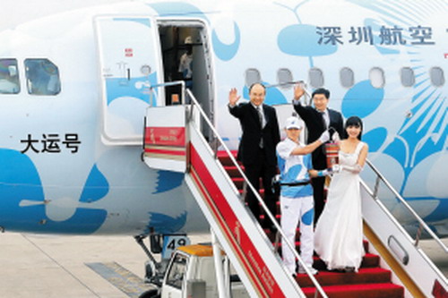 火種5月4日下午抵深 [深圳特區(qū)報訊]5月4日17時15分,隨著彩繪有大運宣傳圖案的深航“大運號”飛機降落在寶安機場,第26屆大運會火種順利運抵大運會舉辦城市深圳。 17時20分,機艙門打開。身著白色長裙的大運火種采集手之一――深圳大學學生栗璐雅和另一名身著運動服的護衛(wèi)手捧火種燈,走出機艙。兩人身后,是一同隨機護送火種的省委常委、市委書記王榮和市長許勤,他們...