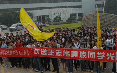 攜筆從戎,保家衛國;腳踏實地,自強不息。12月13日,我校2007年新兵入伍歡送儀式在演會中心廣場隆重舉行。黨委書記江潭瑜親自為入伍學生佩戴大紅花和校徽。前來參加歡送儀式的有各學院老師、同學及部分學生家長和親友。