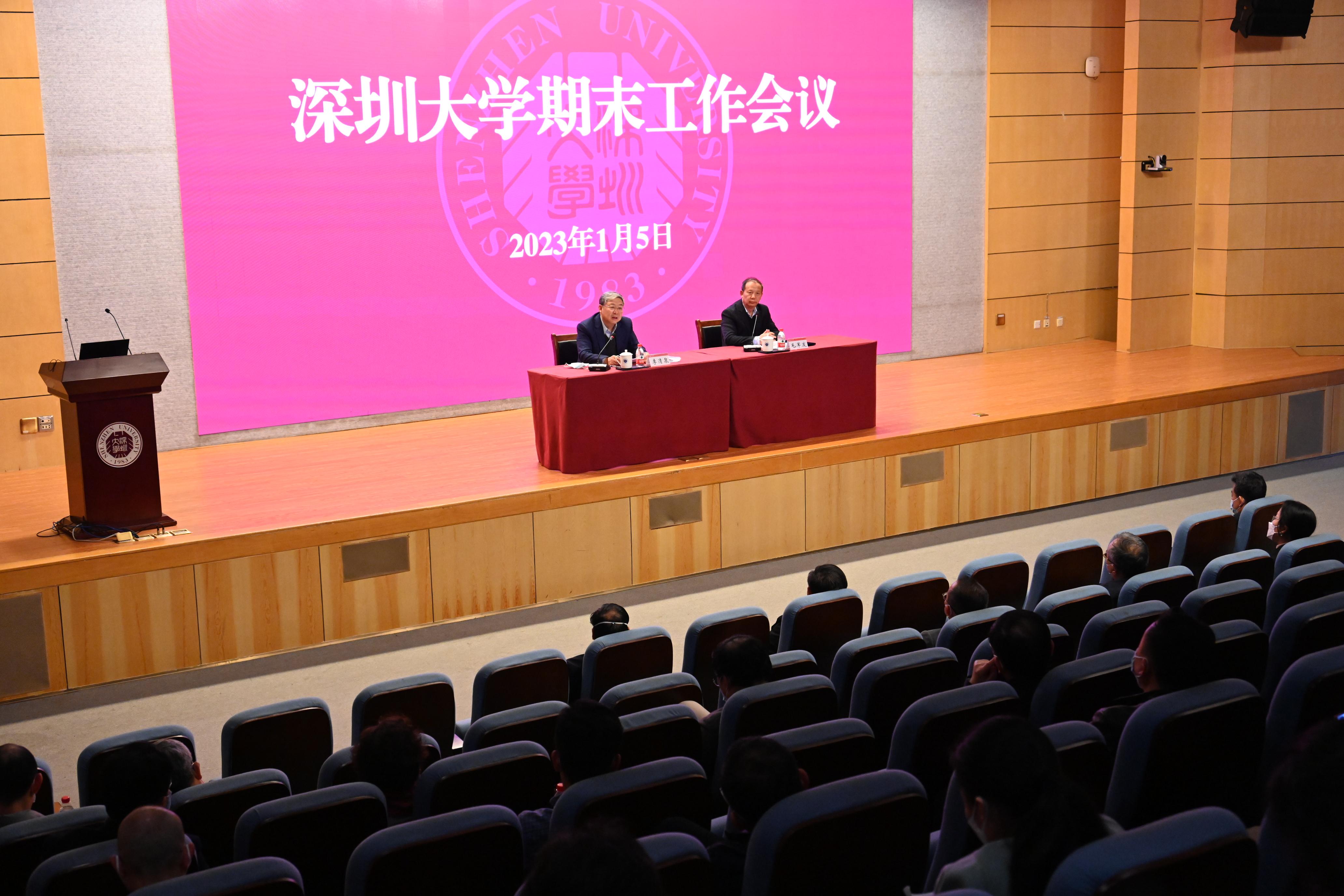 2023年1月5日下午,深圳大學在粵海校區匯星樓1號報告廳召開學校黨委領導班子2022年述責述廉會議暨學校領導班子和領導干部2022年度考核民主測評會,并召開期末工作會議。黨委書記李清泉,校長、黨委副書記毛軍發,黨委副書記、紀委書記王月興,副校長徐晨、李永華、張學記、汪永成、張曉紅、周輝,各學院(部)院長(主任)、書記、執行院長,機關各部門、教輔單位主要負責人(含主持工作的副職),各直屬附屬單位黨政主要負責人...