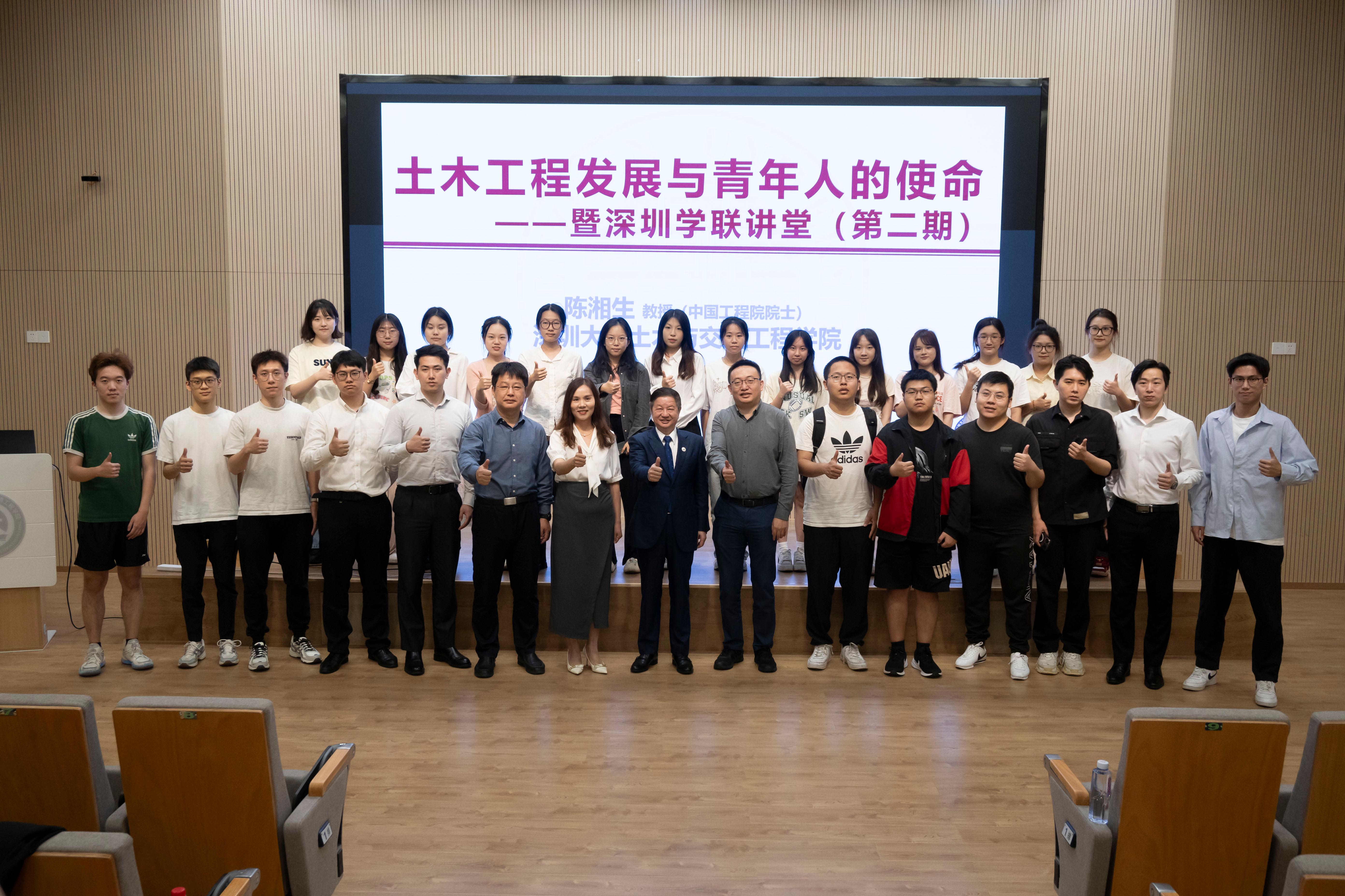 4月3日下午,深圳大學土木與交通工程學院2024年春季學期“思政第一課”暨深圳學聯講堂(第二期)在深圳大學粵海校區南區致工樓報告廳開講。深圳大學土木與交通工程學院院長、中國工程院院士陳湘生以“土木工程發展與青年人的使命”為題,結合自身科研經歷,為同學們帶來了一堂別開生面的思政課,探討土木工程未來的發展前景,鼓勵學子扛起未來之責。