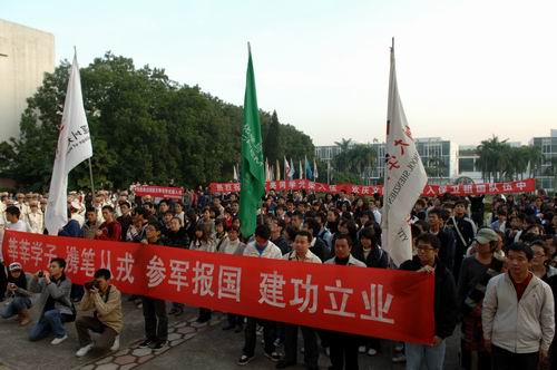 胸佩大紅花,身穿迷彩服,四名陽光男兒,壯志滿懷。11月19日下午,深圳大學2009年進藏兵入伍歡送儀式在圖書館門前廣場舉行。校領導江潭瑜、陶一桃、李永華,南山區委常委、武裝部政委楊群吉上校,相關學院負責人及學生代表參加歡送儀式。 學校武裝部負責人介紹了我校今年征兵工作的情況。深圳大學一直重視國防教育,為了更好地完成好征兵工作,學校成立了以黨委書記、校長為組長,主管武裝工作的黨委副書記...