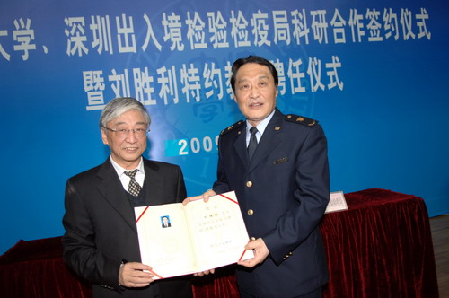12月31日下午,深圳大學、深圳出入境檢驗檢疫局科研合作簽約儀式暨劉勝利特約教授聘任儀式在科技樓二號報告廳舉行。市政協副主席陳思平、深圳出入境檢驗檢疫局局長劉勝利、副局長呂志平及該局各處室負責人,我校校長章必功及各相關部處學院的師生出席了儀式。