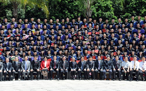 荔園七月,碩果滿枝,深圳大學有了自己的博士畢業生!7月1日上午,深圳大學2010屆優秀畢業生表彰大會在國際會議廳舉行。光學工程專業秦琬、信號與信息處理專業李鵬飛兩位博士畢業生和361名優秀畢業生一起從校黨委書記江潭瑜手中接過證書,聆聽校長章必功的畢業致辭,在畢業前夕受到學校的隆重表彰。校領導邢苗、陶士平、陶一桃、阮雙琛、邢鋒、李鳳亮和各學院、研究生部、各機關部處室負責人,教師代表,2010屆優秀本科畢業生和優秀畢業研究生以及部分家長參加典禮。儀式由副校長邢鋒主持。