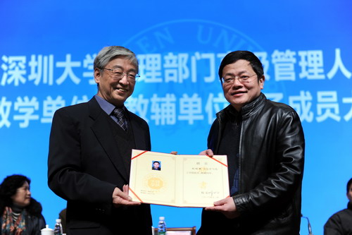 1月12日下午,我校在國際會議廳召開了深圳大學管理部門高級管理人員、教學單位和教輔單位班子成員大會。校領導江潭瑜、章必功、邢苗、陶士平、陶一桃、阮雙琛、邢鋒、李鳳亮以及各管理部門高級管理人員、教學單位和教輔單位班子成員參加了會議。