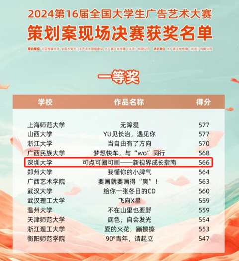 據悉,本屆大廣賽共收到20545組策劃案作品,經過學校初評、賽區評選、全國總評審等環節,在78件二等獎作品中優中選優,最終19組策劃案作品脫穎而出,進入到現場決賽環節。深圳大學傳播學院學生小組,在黃玉波、簡予繁兩位指導老師的帶領下,從眾多參賽小組中脫穎而出,以第五名的優異成績斬獲全國一等獎,展現了她們優秀的策劃能力和扎實的專業功底。