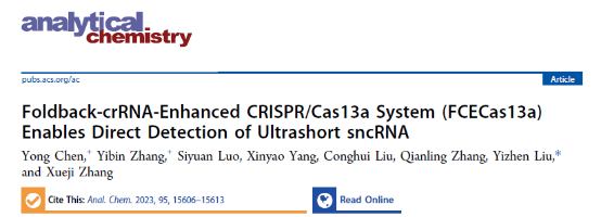 針對這一挑戰,深圳大學化學與環境工程學院劉翼振副教授在國際分析化學頂級期刊、自然指數收錄期刊《AnalyticalChemistry》上發表了題為“Foldback-crRNA-Enhanced CRISPR/Cas13a System (FCECas13a)Enables Direct Detection of Ultrashort sncRNA”的研究成果。深圳大學為獨立通訊單位,已申請國家發明專利(CN116287129A)。https://doi.org/10.1021/acs.analchem.3c02687