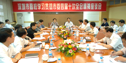 深圳大學黨委書記江潭瑜、校長章必功,深圳職業技術學院校長劉洪一,深圳信息職業技術學院黨委書記、院長張基宏,南方科技大學籌備辦主任梁北漢,深圳電大黨委書記、校長鄧孟忠,深圳大學城管委辦副主任張儒林,新安職業技術學院黨委書記張裕良等高校負責人暢所欲言,就如何貫徹落實市委四屆十次全會精神,從各校實際出發,提升各自辦學特色、質量和水平,實現高等教育的跨越式發展進行熱烈討論。