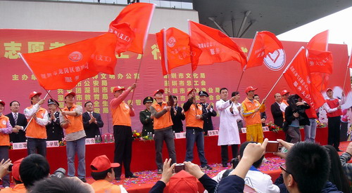 深圳市副市長、市公安局局長李銘,省消防總隊副總隊長丁潘明,團市委書記劉燕,消防局局長許東平等領導出席了這次活動。我校有60名志愿者(義工)代表參加了此次啟動儀式。 儀式上還成立了我校消防志愿者(義工)服務大隊,省消防總隊副總隊長丁潘明向我校消防志愿者(義工)服務大隊授隊旗。 (校團委 供稿)