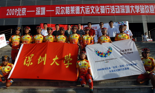 “2009深圳-貝爾格萊德大運文化騎行活動”經(jīng)過了50天的艱苦歷程,從北京出發(fā)經(jīng)過11個省3個直轄市,于7月1日正式返回深圳。我校在科技樓舉行了大運文化騎行活動歡迎儀式及文化論壇。參加活動的人員包括:市大運會執(zhí)行局副局長柯剛明、我校副校長邢鋒等以及12明騎行志愿者和我校部分研究生。