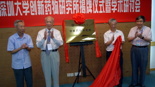 章必功及與會嘉賓為深圳大學創新藥物研究所揭牌。隨后,章必功向侯云德、王振義、姚新生、王夔四位院士及其代表頒發深圳大學創新藥物研究所顧問聘書。王振義院士、姚新生院士等先后致辭,對研究所的成立表示祝賀。