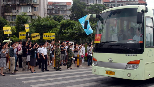 8點20分,三團新生在科技樓集合完畢。在軍訓出發儀式上,李永華號召大家“按照部隊和學校的要求,嚴守紀律,刻苦訓練,一定要在軍事訓練、軍事素質和心理素質方面培養自己的毅力和能力”。8點30分,30余輛大巴從正門出發,開赴葵涌,阮雙琛等校領導在路旁面帶微笑,揮手致意,目送新生離開。9點30分,白石路上的大巴整齊待命,陶一桃、李永華等領導在此歡送軍訓一團、二團學生,軍樂團奏響歡送曲,大巴開往廣州、佛山。
