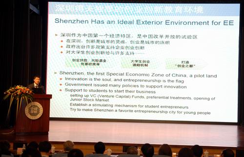 邢鋒教授向與會者介紹深圳大學多年來的創(chuàng)業(yè)教育情況。從早年實驗性地開辦學生銀行到今天形成比較完整的創(chuàng)業(yè)教育體系:開設創(chuàng)業(yè)教育課程和實驗室基金,開展創(chuàng)業(yè)創(chuàng)新比賽,建立創(chuàng)業(yè)園等,深圳大學一直在探索成功的創(chuàng)業(yè)教育模式,培養(yǎng)出馬化騰、周海江、史玉柱等等出類拔萃的大企業(yè)家。邢鋒指出,如何處理創(chuàng)業(yè)教育和通識教育的關系并合理利用社會資源是深圳大學今后需要思考解決的問題。