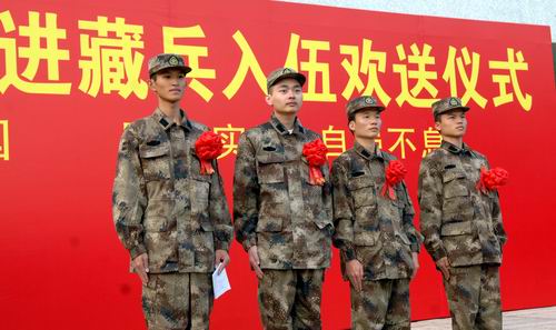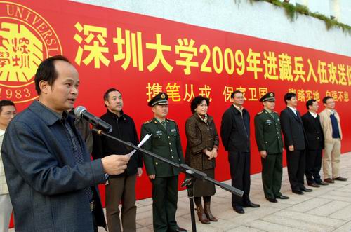 胸佩大紅花,身穿迷彩服,四名陽光男兒,壯志滿懷。11月19日下午,深圳大學2009年進藏兵入伍歡送儀式在圖書館門前廣場舉行。校領導江潭瑜、陶一桃、李永華,南山區委常委、武裝部政委楊群吉上校,相關學院負責人及學生代表參加歡送儀式。