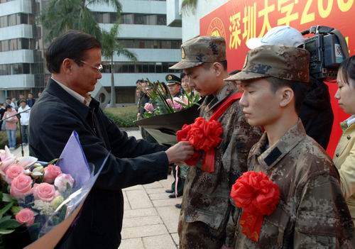 學校武裝部負責人介紹了我校今年征兵工作的情況。深圳大學一直重視國防教育,為了更好地完成好征兵工作,學校成立了以黨委書記、校長為組長,主管武裝工作的黨委副書記和主管學生工作的副校長為副組長,成員包括學校武裝部、黨辦、校辦、宣傳部、財務處和各學院領導的征兵工作領導小組,為今年征兵工作打下了堅實的組織基礎。通過一系列宣傳發動工作,使征兵政策深入人心,充分調動了全校學生關心國防、報名參軍的積極性。學生參軍熱情極其高漲,各級電視臺、報紙、電臺都對深圳大學的征兵工作作了連續的報道和高度的肯定。整個報名期間,學生熱情高漲,共283人報名,72人(其中26名女生)參加體檢,合格40人(其中14名女生)。