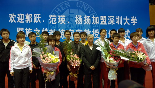 中國女子乒乓球隊主教練施之皓攜得意弟子郭躍、范瑛、楊揚加盟深圳大學!深大學子期盼已久的體育明星同學的到來,引來了2000多名師生早早等候在元平體育館,以最大的熱情對他們表示歡迎。12月8日晚,“歡迎郭躍、范瑛、楊揚加盟深圳大學暨施之皓教練客座教授聘任儀式”在元平體育館舉行。我校校長章必功,副校長李永華、李鳳亮等校出席了聘任儀式。李永華主持儀式。