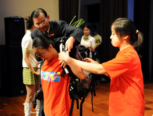 今年我校還有12名同學將赴祖國西部進行為期一年的志愿服務,江潭瑜向12名西部志愿者贈送紀念品。