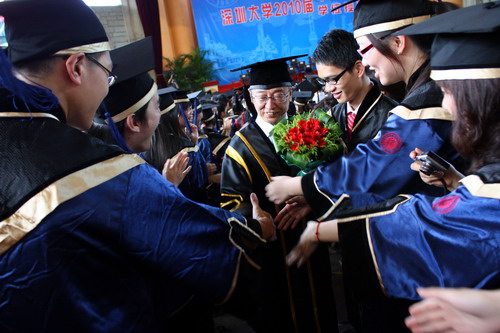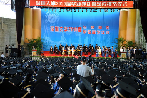 7月2日至4日,三天時間里,深圳大學2010屆本科生畢業典禮暨學位授予儀式在演會中心舉行。校學位評定委員會主席、校長章必功,校學位評定委員會副主席:陶士平、陶一桃、阮雙琛、邢鋒、李永華、李鳳亮和教務處、學生處、招生就業辦等部門負責人,各學院院長、書記、教師代表以及觀禮家長等出席儀式。