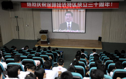 在深圳經濟特區迎來30華誕之際,胡錦濤總書記親臨深圳出席慶祝大會,讓深圳人民倍感振奮,備受鼓舞。作為深圳唯一一所綜合性大學,我校學子非常關注深圳經濟特區30周年慶祝大會的盛況,學校在科技樓三號報告廳及辦公樓等地都開放了大屏幕,供全校師生收看慶典盛況。其中科技樓三號報告廳座無虛席,數百名來自各學院的學生懷著激動的心情,透過大屏幕聚精會神地觀看現場盛況。