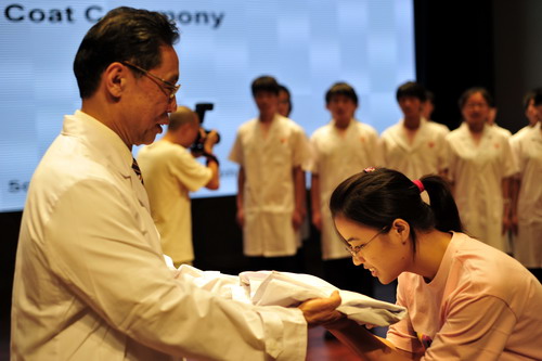 新生代表受佩校徽、由鐘南山院士親手授白袍,并且舉行了莊嚴的新生宣誓儀式。