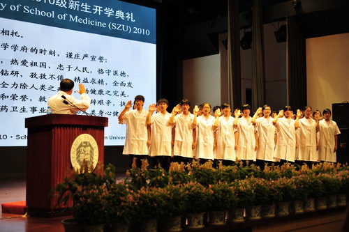 9月13日下午,醫(yī)學院2010級開學典禮在我校國際會議廳舉行。中國工程院院士、深圳大學醫(yī)學院名譽院長鐘南山親自為30名臨床醫(yī)學專業(yè)新生授白袍。章必功校長以及深圳市衛(wèi)生系統(tǒng)的嘉賓出席了開學典禮。陳思平教授主持典禮。