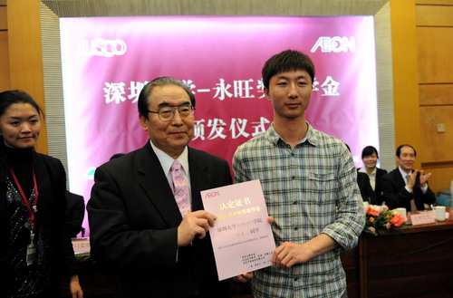 11月29日下午,深圳大學―永旺獎助學金頒發儀式在國際會議廳D廳舉行。日本永旺1%俱樂部委員長原田昭彥,事務局長友村自生,永旺華南商業有限公司董事總經理折口史明,副總經理葉青,行政部總經理佐佐木正博,永旺信貸財務(亞洲)有限公司執行董事?方俊哉,我校副校長李永華,外事處、學生處相關負責人及獲獎學生出席了儀式。