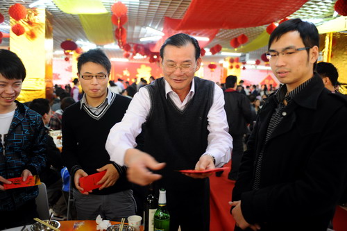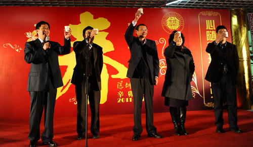 金虎留福辭舊歲 玉兔送瑞迎新年。大年三十的深大校園,洋溢著一股濃濃的年味。為了讓留校過年的師生也能感受家庭般的溫暖與幸福,大年三十中午,校領導江潭瑜、陶一桃、阮雙琛、邢鋒、李永華率有關部門和各學院負責人、老師,與留校師生及部分學生家長歡聚一堂,共進除夕團圓飯,歡歌熱舞慶新春。活動由副校長李永華主持。