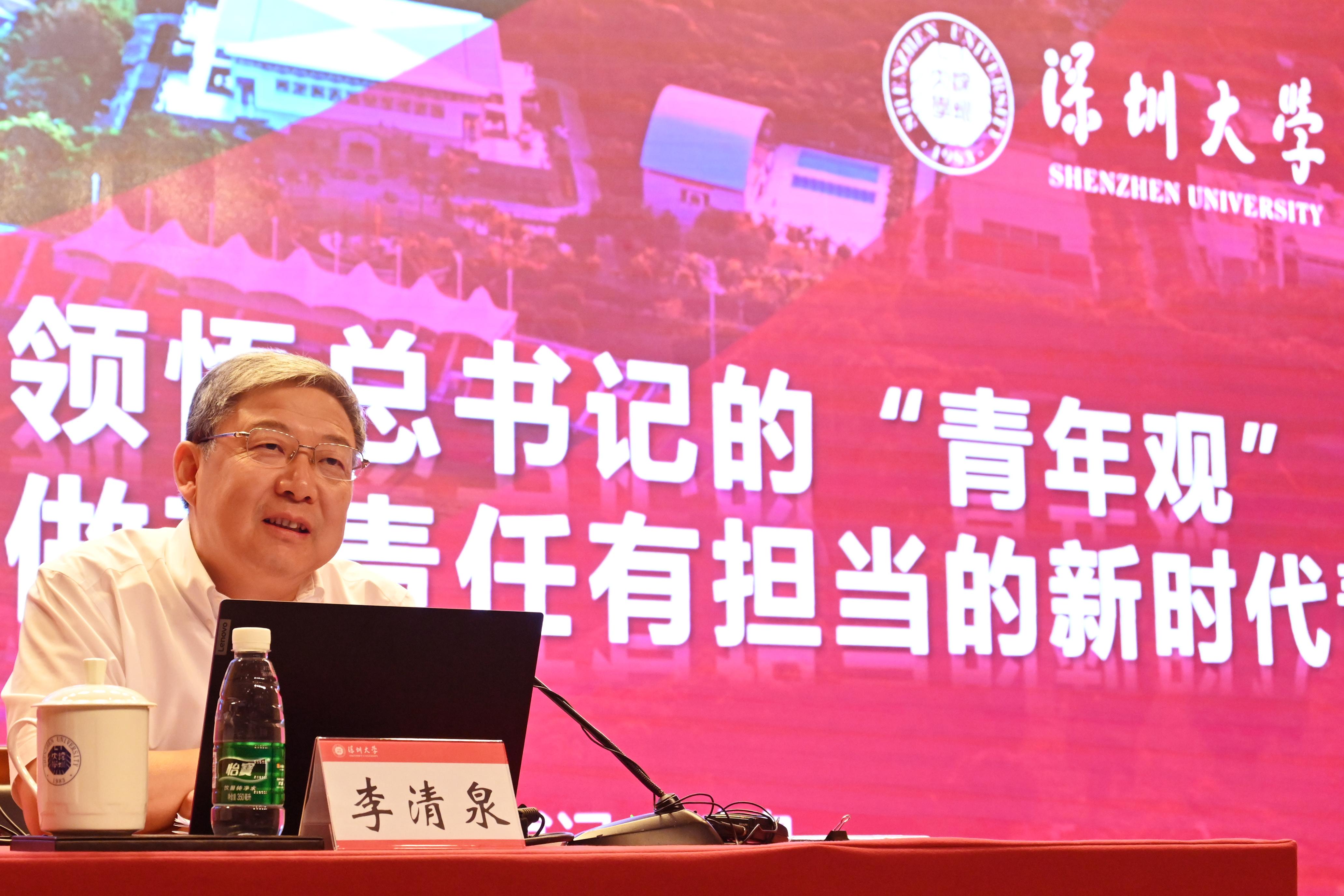 李清泉結合學習貫徹十九屆六中全會精神、習近平總書記在考察清華大學、中國人民大學時的重要講話以及習近平總書記在慶祝中國共產主義青年團成立100周年大會上的重要講話等,帶領師生共同領悟習近平總書記的“青年觀”以及對高校立德樹人工作的啟示。他指出,習近平總書記的“青年觀”指明了廣大青年成長成才的發展方向與實現路徑,也提出了高校做好新時代青年教育工作的遵循與指南,為高校在新時代牢牢抓住理想信念鑄魂這個關鍵環節、完成立德樹人根本任務、做好三全育人工作指明了方向、提供了引領。李清泉強調,深圳大學響應習近平總書記的號召,堅持將立德樹人貫穿于學校人才培養的全過程,全面推進“三全育人”,如通過出臺《深圳大學關于構建新時代學生工作新格局的若干意見》《深圳大學學生心理健康工作方案》,不斷完善落實立德樹人根本任務的制度機制;通過創新思政課程、推進課程思政,在知識傳授過程中強化德育教育和思想價值引領;通過舉辦“書記下午茶”“校長午餐會”等活動,聆聽學生心聲、貼近學生需求,拓展與學生直接交流的渠道;通過落實“健康荔園”體育運動計劃等,強化體育育人作用等。