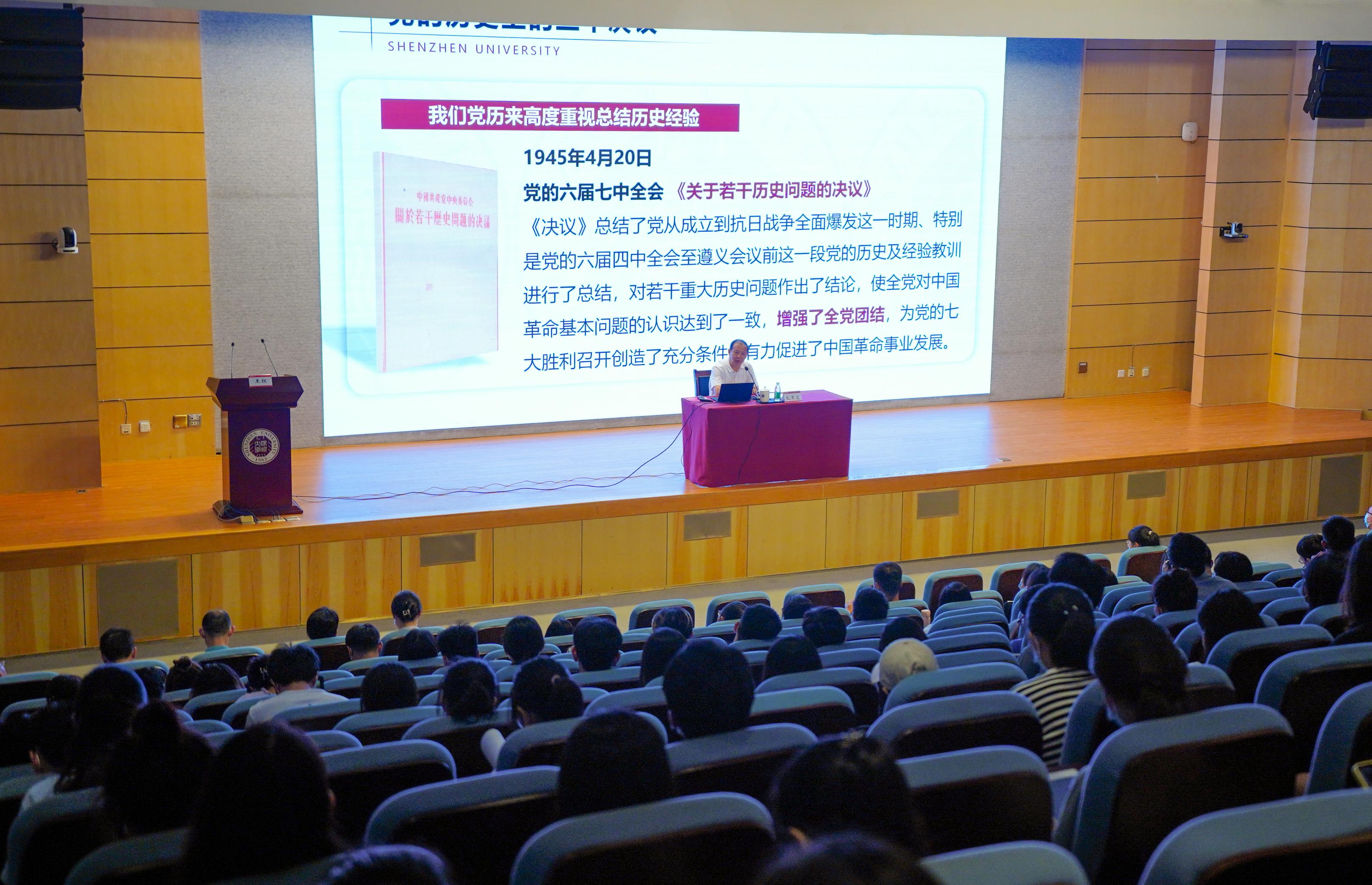 6月14日下午,深圳大學校長毛軍發在粵海校區匯星樓一號報告廳為師生講授題為《學習黨的十九屆六中全會精神,接力建設世界一流創新型大學》的思政課。粵海和麗湖兩個校區的師生代表聆聽了此次講座,其中麗湖校區師生在守忠樓一樓報告廳采用線上視頻的方式同步學習。