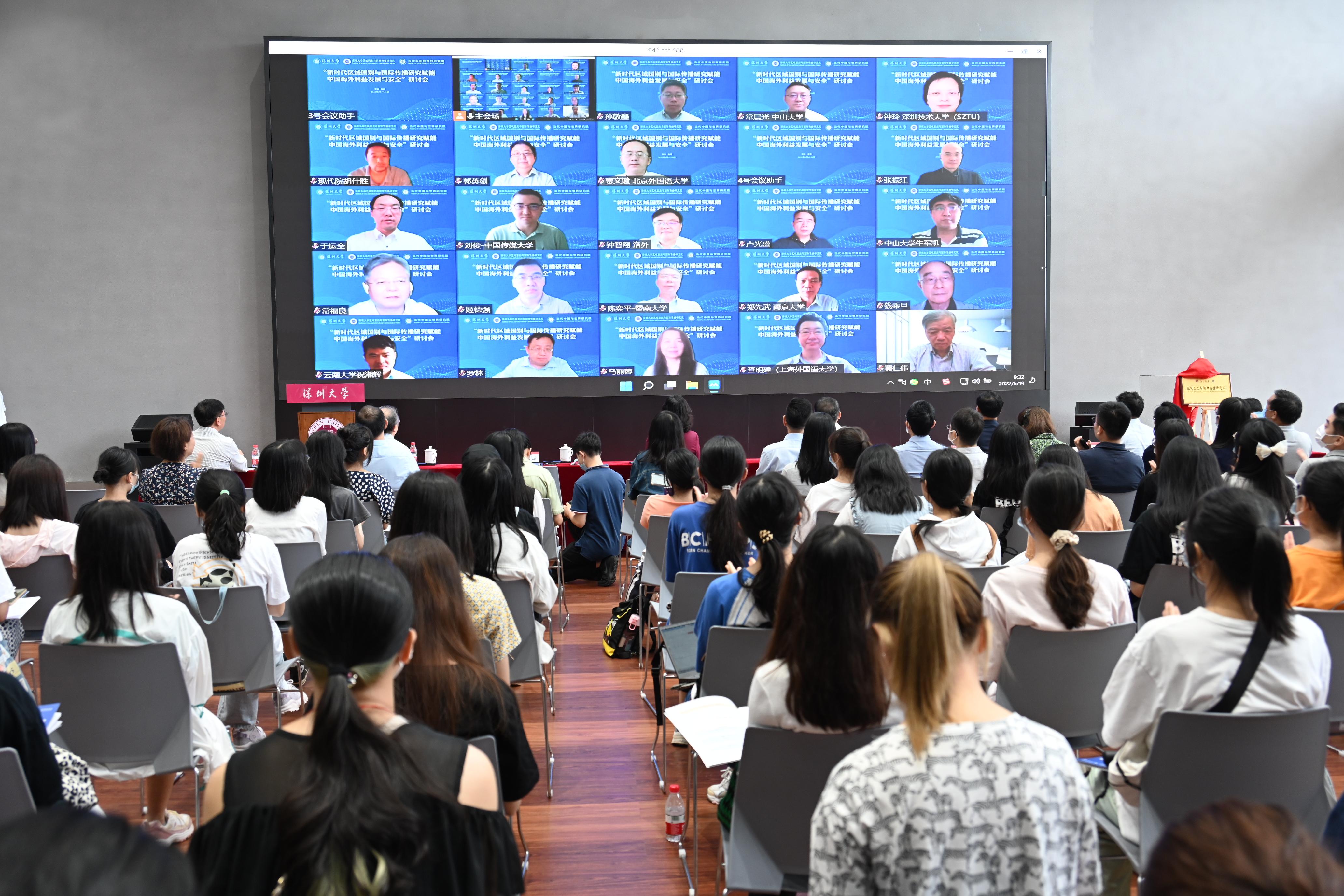 6月19日上午,深圳大學區域國別與國際傳播研究院(下稱“深大國傳院”)成立儀式暨“新時代區域國別與國際傳播研究賦能中國海外利益發展與安全”研討會在粵海校區校友廣場舉行。中國外文局副局長于濤、深圳大學副校長張曉紅、深圳市委外事辦公室副主任孫懷忠、深圳市社會科學院副院長楊建以線上線下方式出席儀式并致辭,共同為國傳院揭牌。