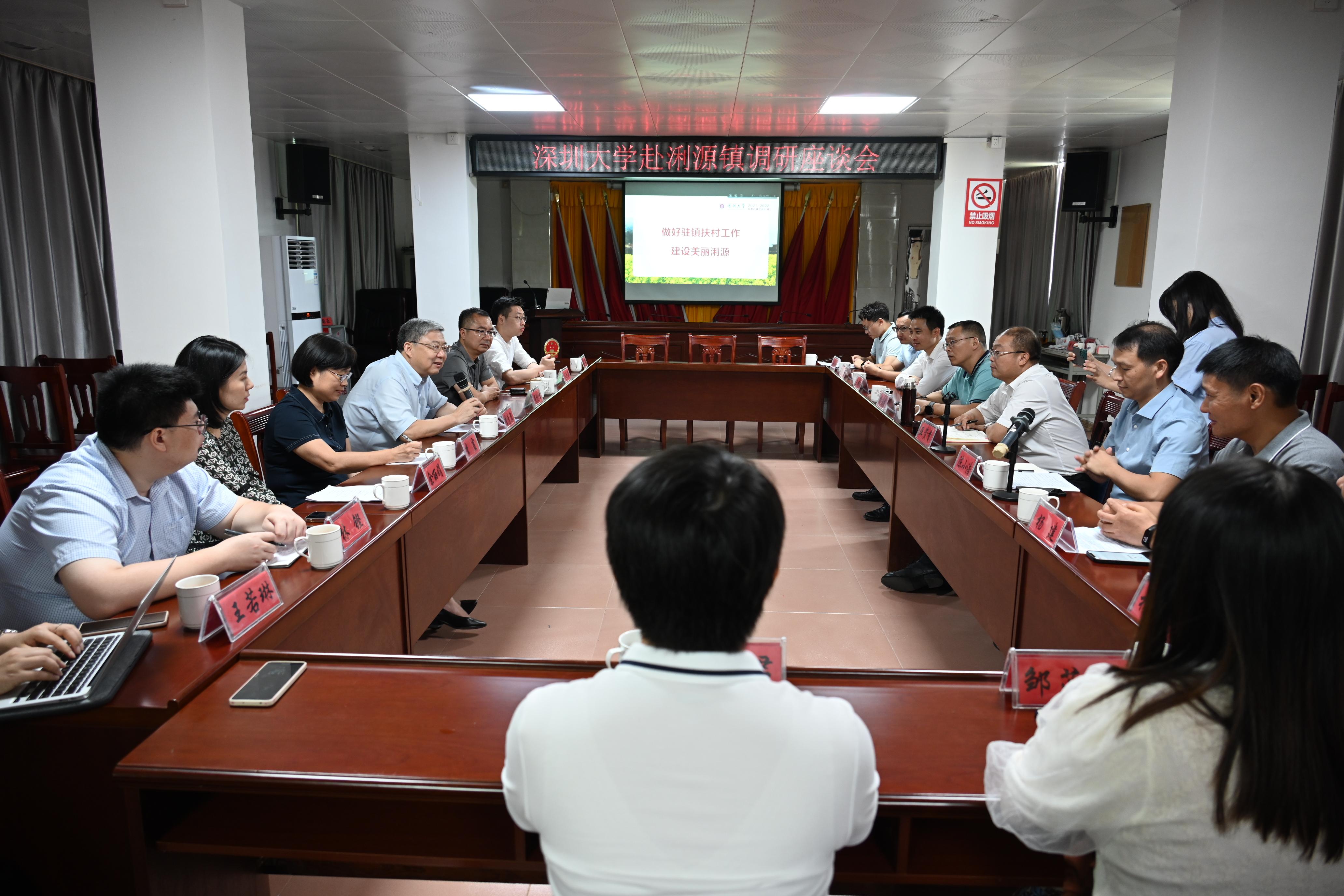 在河源市迎賓館,李清泉與何國森、謝春艷等河源市領導就深圳大學對口幫扶河源市產業共建、基礎教育幫扶等工作展開座談。河源市教育局、科技局負責人參加座談。