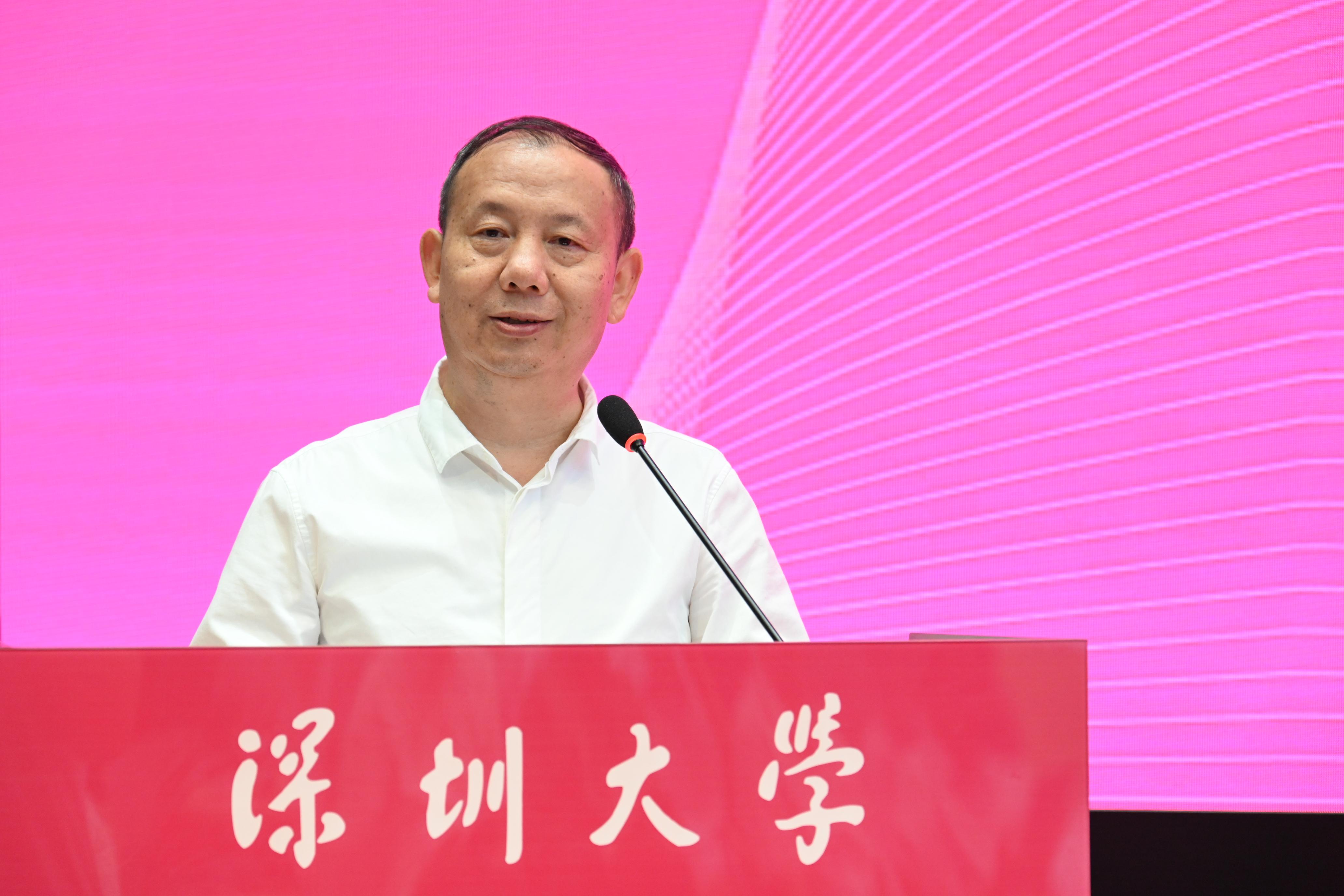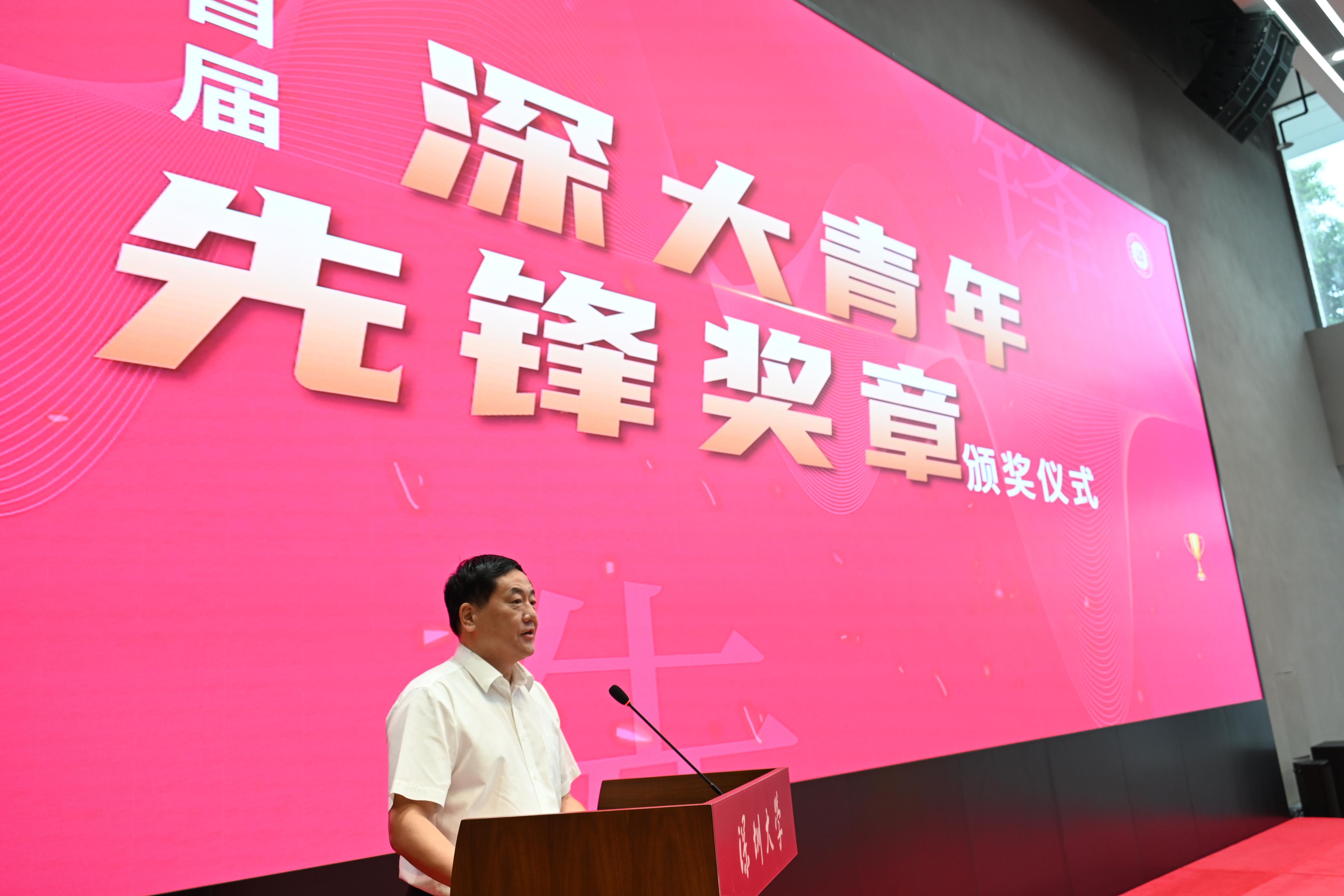 頒獎完畢后,毛軍發在致辭中表示,9月27日是深圳大學校慶日,首屆“深大青年先鋒獎章”頒獎儀式在這一天隆重舉行,有著重要的意義。辦學39年來,深圳大學因改革開放而生,因開拓創新而興,綜合實力得到全面快速提升,跑出了中國高等教育改革發展的“深大速度”。今天致頒獎詞的老師和優秀校友代表,以及獲得獎項的集體和個人,都體現了學校對青年師生全方面著力培養的成果,是創造“深大速度”征途中“深大質量”的精彩呈現,是深大人拼搏奮進過程中的互相勉勵,是對“深大精神”的美好傳承。今天獲獎的集體和個人,有在關鍵領域進行前沿探索、攻堅“卡脖子”難題的教學科研工作者,有堅守崗位多年如一日、甘當鋪路石的思政學工教師,有在各大賽場揚我國威、為校爭光的優秀團隊,有赤誠報國、無私奉獻、用智慧點亮山村用熱血延續生命的青春力量,他們是當之無愧的“深大先鋒”。