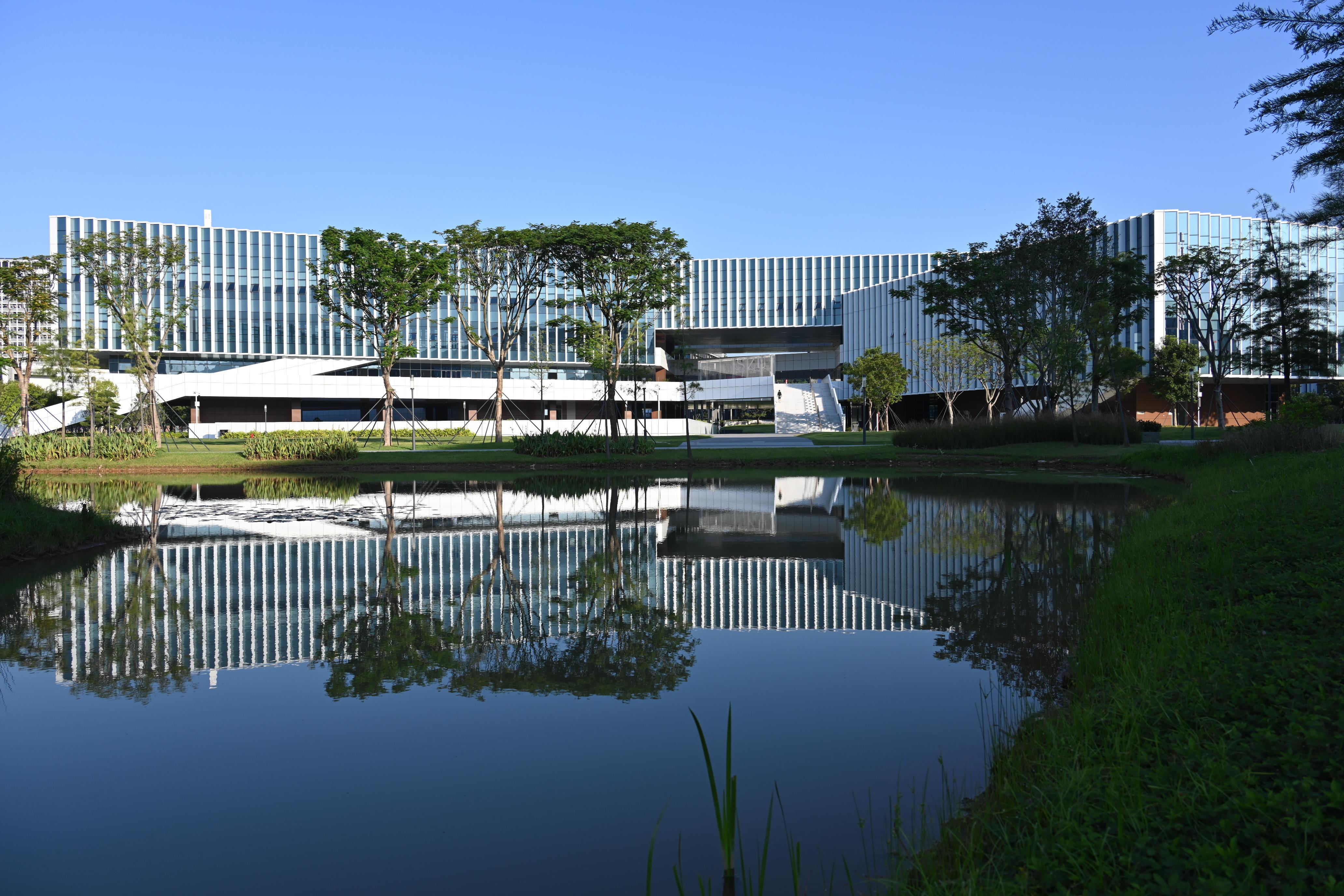 中央圖書館的設計融合現代科技和綠色生態理念,是一座符合現代大學理念、體現特區大學特色的圖書館,為同學們提供更加舒適的閱讀環境。建筑主體采用全鋼框架,最大懸挑長度達15米,最大跨度超36米,室內凈高超過4米,給人以強烈的空間感與科技感。金屬幕墻與玻璃幕墻巧妙配合,不僅增強了自然采光,還能減弱直射炫光。各類家具采用綠色環保材料,閱讀環境更加舒適。