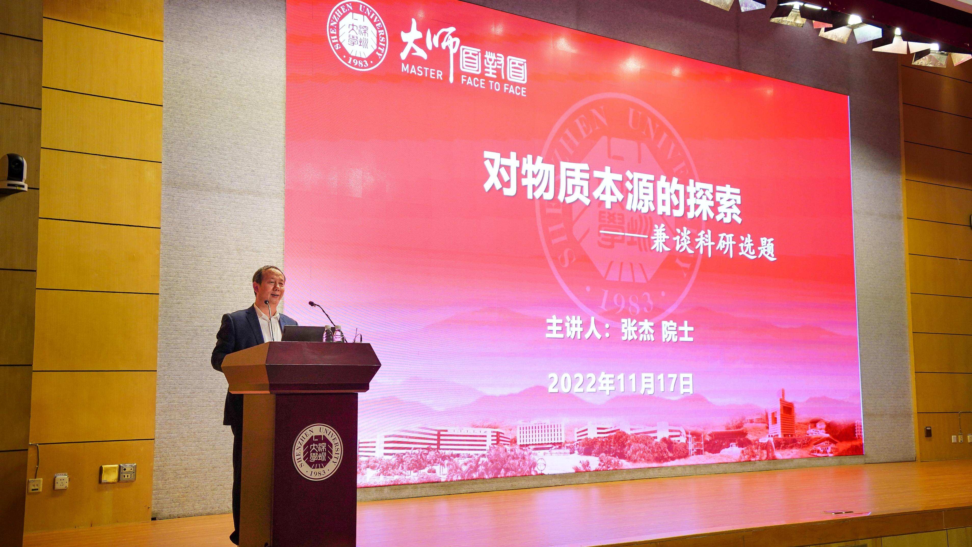 138億年前的宇宙大爆炸后發(fā)生了什么?如今人類探索宇宙本源的極限在哪里?人類離揭開暗物質(zhì)的秘密還有多遠(yuǎn)?11月17日,深圳大學(xué)匯星樓一號(hào)報(bào)告廳座無虛席,著名物理學(xué)家、李政道研究所所長、五院院士、上海交通大學(xué)原校長張杰出現(xiàn)在“大師面對(duì)面”講座上,用一場精彩的學(xué)術(shù)報(bào)告,帶現(xiàn)場的師生“穿越”138億年的時(shí)空之旅,分享了關(guān)于宇宙物質(zhì)起源與演化最前沿的科學(xué)發(fā)現(xiàn)與思考。深圳大學(xué)校長、中國科學(xué)院院士毛軍發(fā)主持了這次報(bào)告會(huì)。深圳市政協(xié)原主席戴北方,中國工程院院士范滇元,深圳大學(xué)副校長徐晨、李永華出席報(bào)告會(huì)。