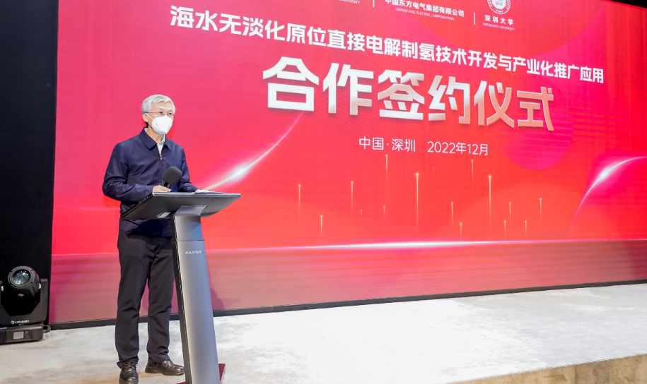 12月16日,深圳大學/四川大學謝和平院士團隊與東方電氣股份有限公司、東方電氣(福建)創新研究院有限公司簽署“海水無淡化原位直接電解制氫原創技術中試和產業化推廣應用”的四方合作協議。