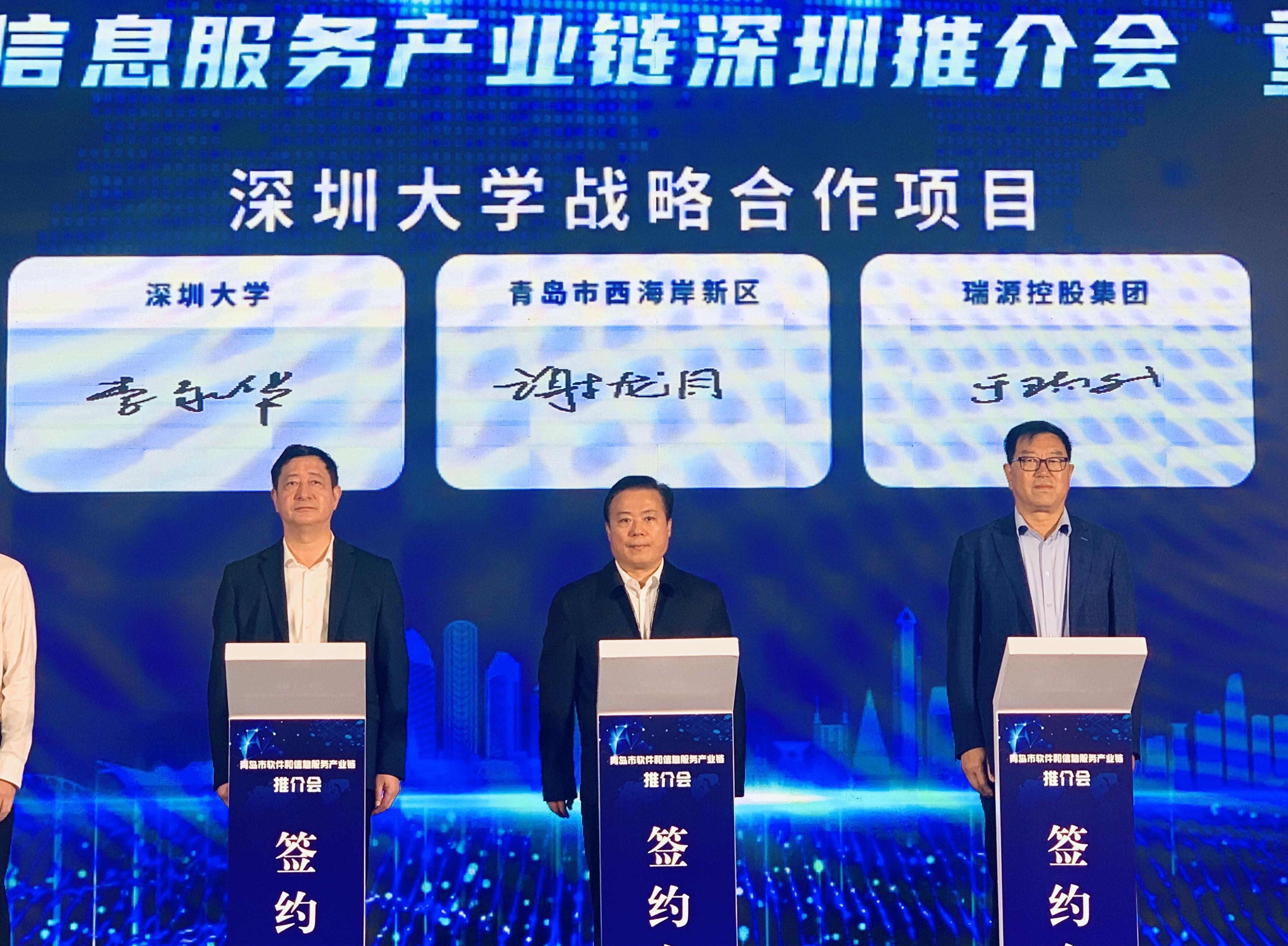 2月21日上午,青島市委常委、組織部長(zhǎng)于玉,深圳大學(xué)副校長(zhǎng)李永華出席青島市軟件和信息服務(wù)產(chǎn)業(yè)鏈深圳推介會(huì)。會(huì)上,李永華代表深圳大學(xué)與青島西海岸新區(qū)管理委員會(huì)、青島瑞源工程集團(tuán)有限公司簽訂戰(zhàn)略框架合作協(xié)議。下午,于玉一行來到深圳大學(xué)調(diào)研考察合作項(xiàng)目,李永華陪同來賓參觀深圳大學(xué)校史館后,雙方在粵海校區(qū)匯元樓201會(huì)議室舉行座談會(huì)。青島市西海岸新區(qū)工委副書記、區(qū)長(zhǎng)王清源,青島市工業(yè)和信息化局黨組書記、局長(zhǎng)卞成,瑞源控股集團(tuán)黨委書記、董事長(zhǎng)陪同調(diào)研。