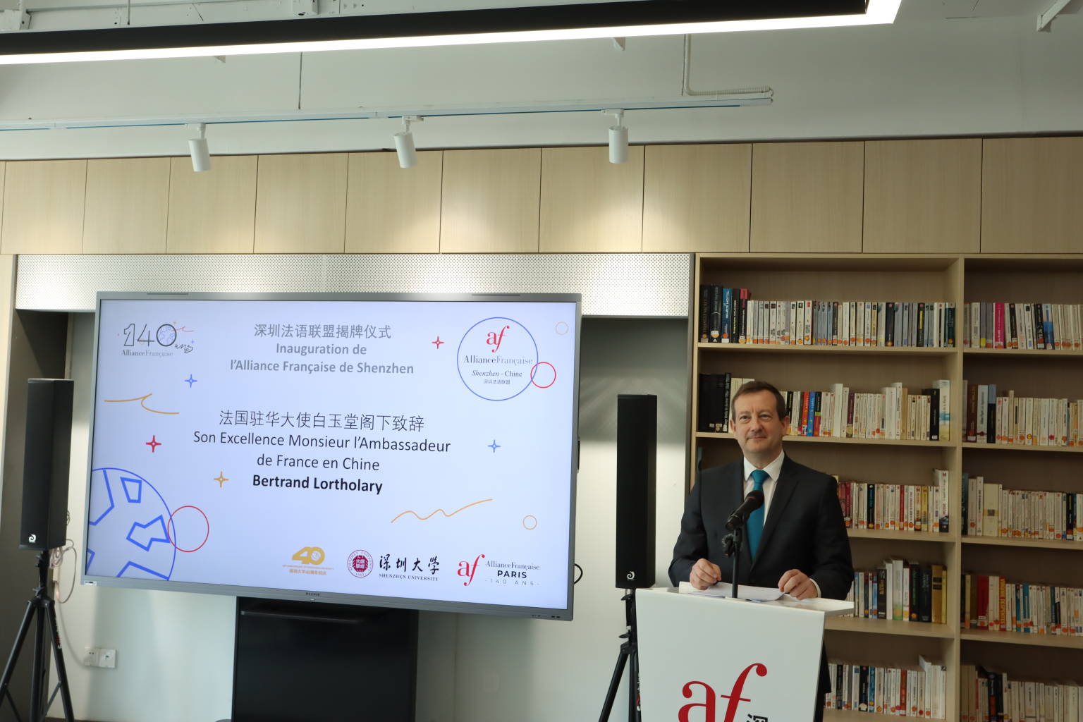 4月10日,深圳法語聯盟在深圳大學正式揭牌,法國駐華大使白玉堂(Bertrand LORTHOLARY),深圳大學校長、中國科學院院士毛軍發出席活動,并共同為聯盟揭牌。揭牌儀式前,毛軍發與白玉堂大使進行會談。深圳大學副校長張曉紅教授主持揭牌儀式。