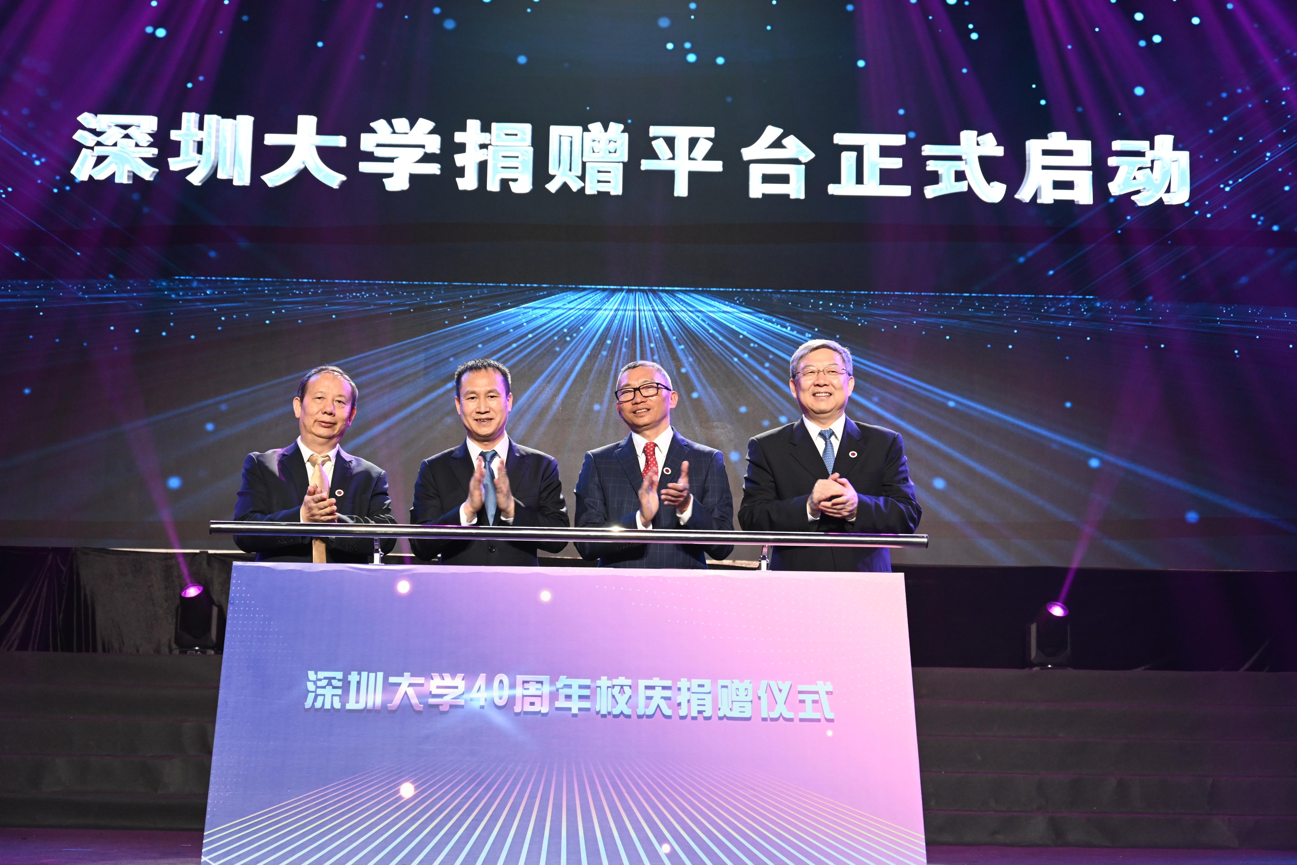 捐贈簽約儀式結束后,曾湃、李清泉、毛軍發、陳一丹來到舞臺中央,在全場倒計時聲中,嘉賓共同推動啟動桿,深圳大學捐贈平臺正式啟動。