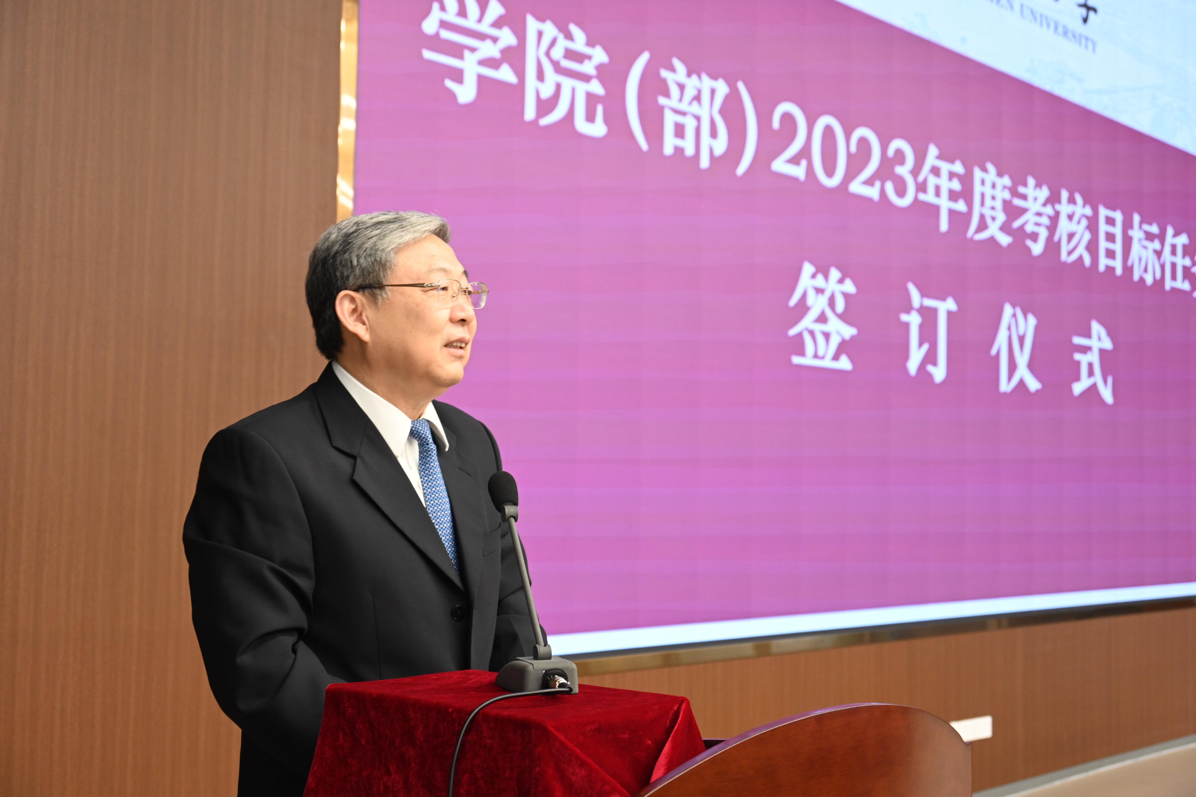 為推進(jìn)學(xué)校“十四五”規(guī)劃目標(biāo)任務(wù)落實、落地,深入推動學(xué)院(部)“十四五”發(fā)展建設(shè),4月27日下午,深圳大學(xué)學(xué)院(部)2023年度考核目標(biāo)任務(wù)書簽訂儀式在麗湖校區(qū)啟明樓C101多功能廳舉行。校黨委書記李清泉、校長毛軍發(fā),副校長徐晨、李永華、張曉紅出席,副校長張學(xué)記主持儀式,有關(guān)職能部門、各學(xué)院(部)黨政主要負(fù)責(zé)人參加會議。