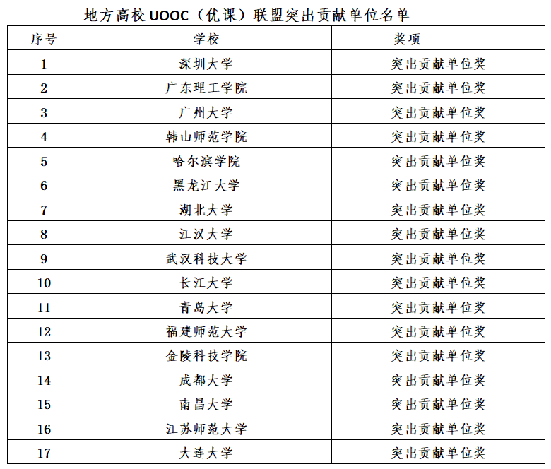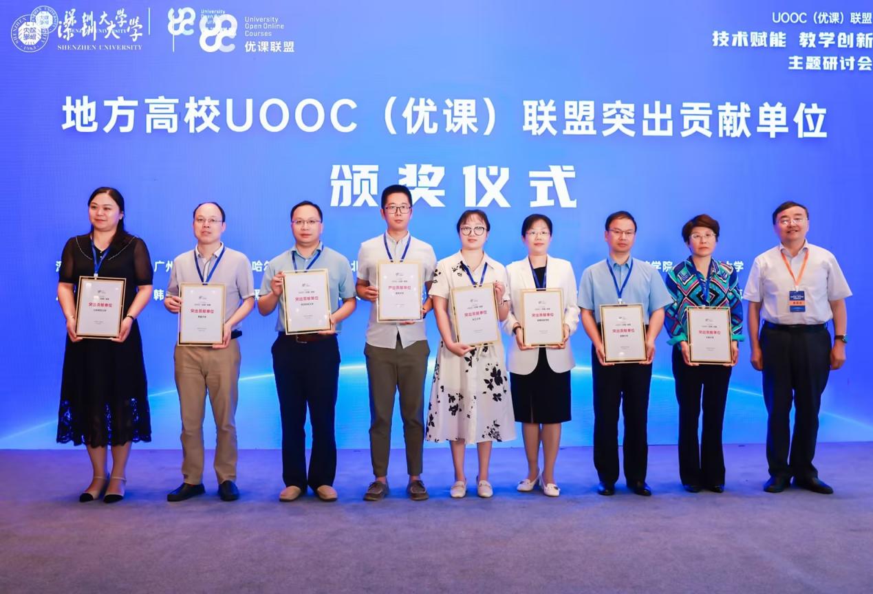 李清泉和徐曉飛為獲得地方高校UOOC(優課)聯盟突出貢獻單位獎的17所高校代表頒獎。