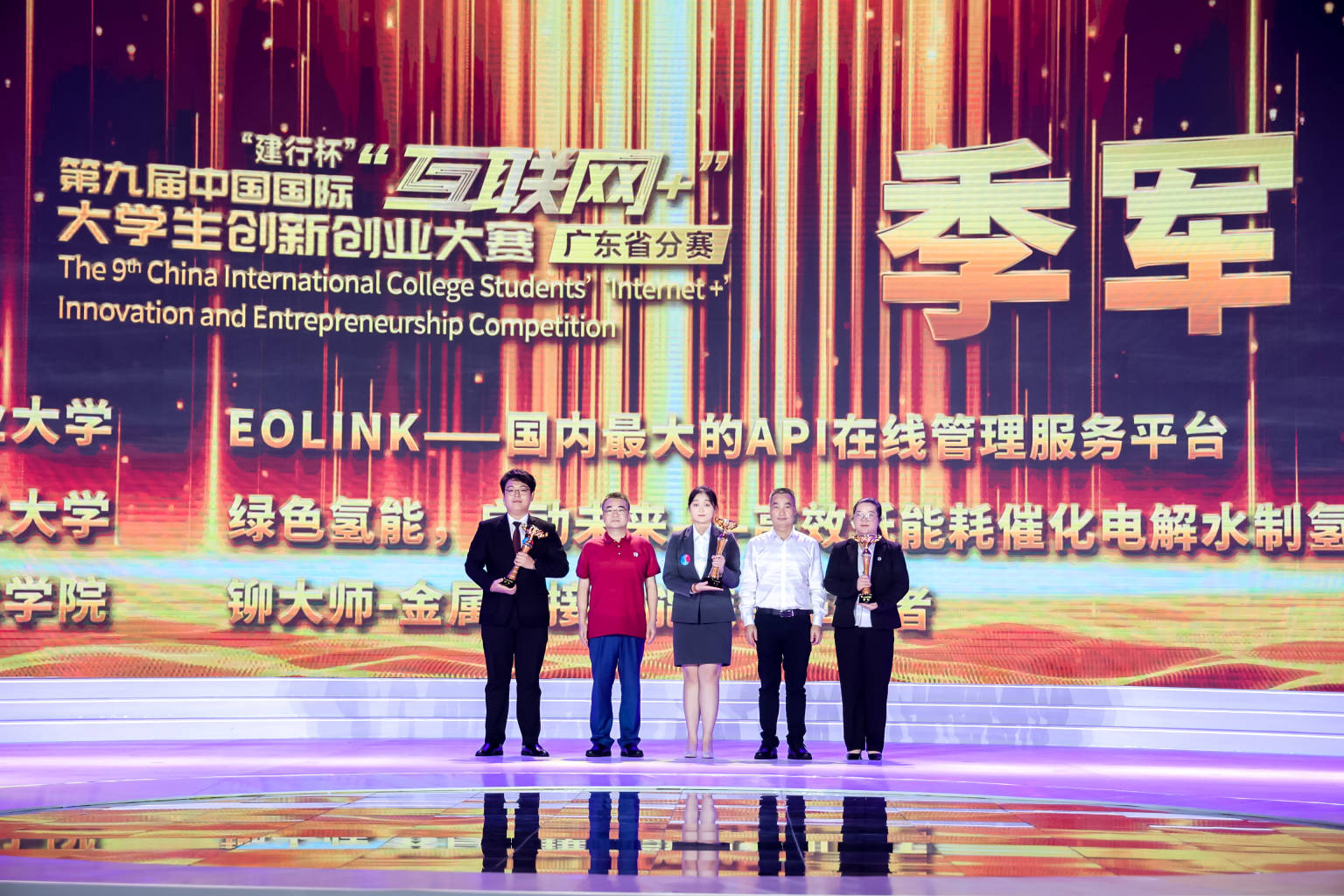 作為本屆“互聯網+”廣東省分賽的巔峰之戰,冠軍爭奪賽可謂高手過招、強強對決。現場座無虛席,氣氛熱烈,處處洋溢著青春的活力和熱情。經過兩個小時的激烈角逐,深圳大學“水利萬物”項目以1125分的高分超越其他對手斬獲冠軍,也是本次冠軍賽6個項目中唯一一個得分超過1000分的項目。南方醫科大學“液之星生物”項目、暨南大學“薪傳時光”項目均以930分獲得亞軍,華南理工大學“綠色氫能”項目、廣東工業大學“Eolink”項目、深圳職業技術學院“鉚大師”項目獲得季軍。此外,華南理工大學等15所普通本科院校和廣東輕工職業技術學院等15所職業院校獲得學校集體獎。昨日的金獎爭奪賽還產生了高教主賽道、“青年紅色筑夢之旅”賽道、職教賽道、產業命題賽道共136個金獎(有項目分數相同并列獲獎,因此比既定金獎數量多1個)。據悉,廣東省將有80個左右的項目進軍國賽,部分項目已具備沖擊“國金”實力。