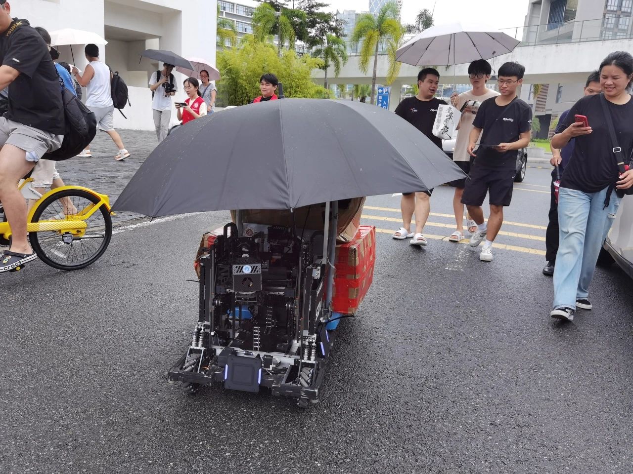 在智慧化迎新方面,深大還推出了“科技與狠活兒”。在粵海校區南區,只見一個造型硬朗的機器人拖著行李艙、“手”持小旗幟,正將新生的部分行李運往宿舍,下雨的時候它甚至還能“撐傘”防止行李淋濕。2020級機電與控制工程學院同學介紹,這是深圳大學RobotPilots機器人實驗室創新研發的工程機器人,是深大人自主設計、自主研發的成果,今年8月在全國大學生機器人大賽機甲大師超級對抗賽中進入全國八強。袁嘉恒說,該工程機器人能夠負荷70kg左右的重量,能在迎新工作中幫大家節省人力。