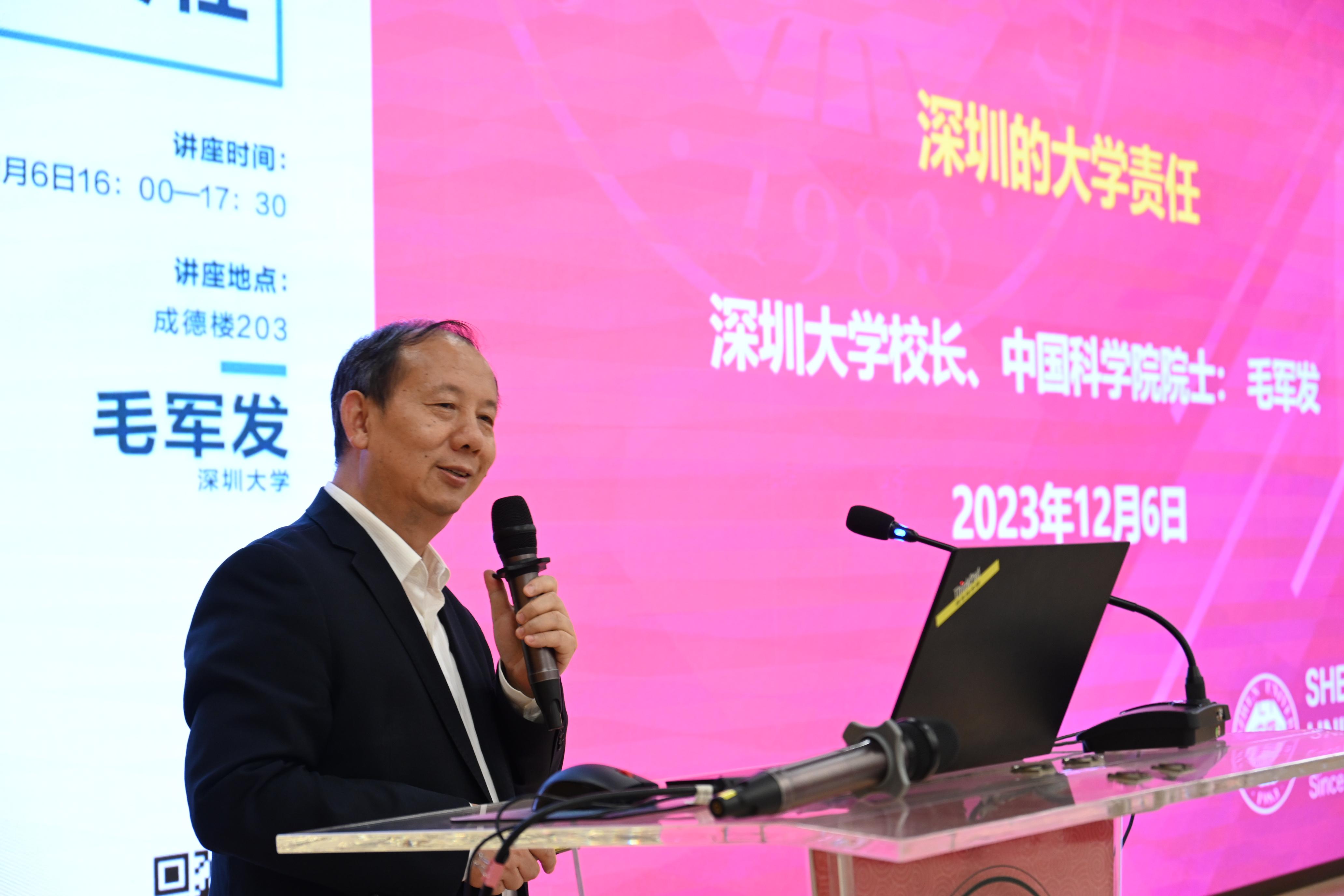 “深圳高校應當如何擔起時代重任?” 毛軍發通過大量的案例、數據和深入淺出的歷史故事,闡釋了深圳的大學責任與努力前行的方向。他以深圳大學發展歷程為例,指出深圳高校應深度服務國家重大戰略和“雙區”建設需求。他說,作為一所伴隨著深圳成長起來的綜合性大學,建校四十年來,深圳大學實施融入深圳城市建設的“三步走”戰略,以高峰學科建設為引領,以高水平師資隊伍建設為核心,打造獨具特色的雙創教育體系,綜合實力快速提升,學科建設成績顯著,創新能力明顯增強,努力推進創建世界一流綜合性大學和新時代中國特色社會主義標桿大學。深圳高校應當不忘初心、牢記使命;銳意改革,敢為人先;發揚特區精神,樹立全局意識。作為“特區大學”,深圳大學理當扛起這樣的責任。