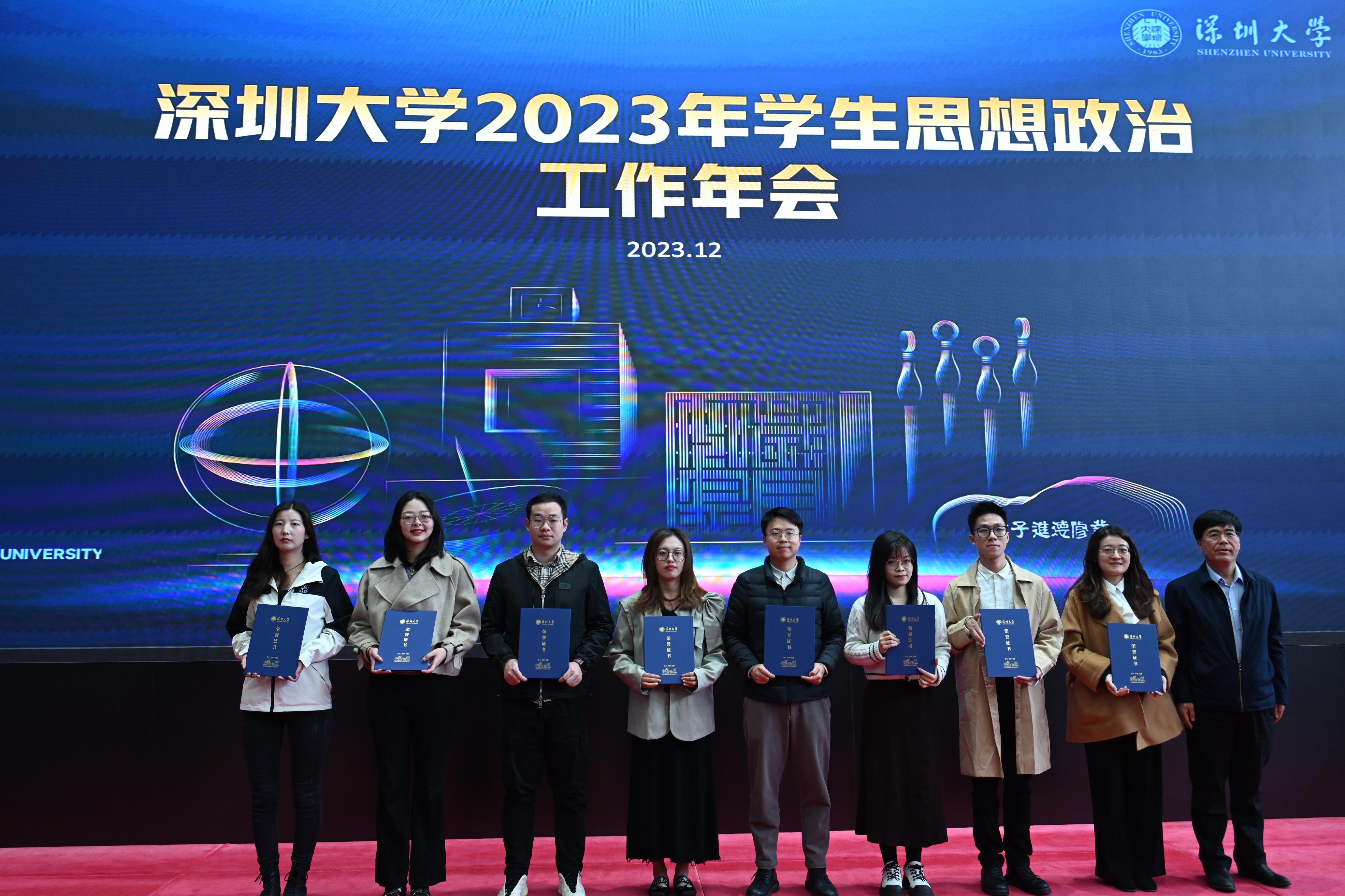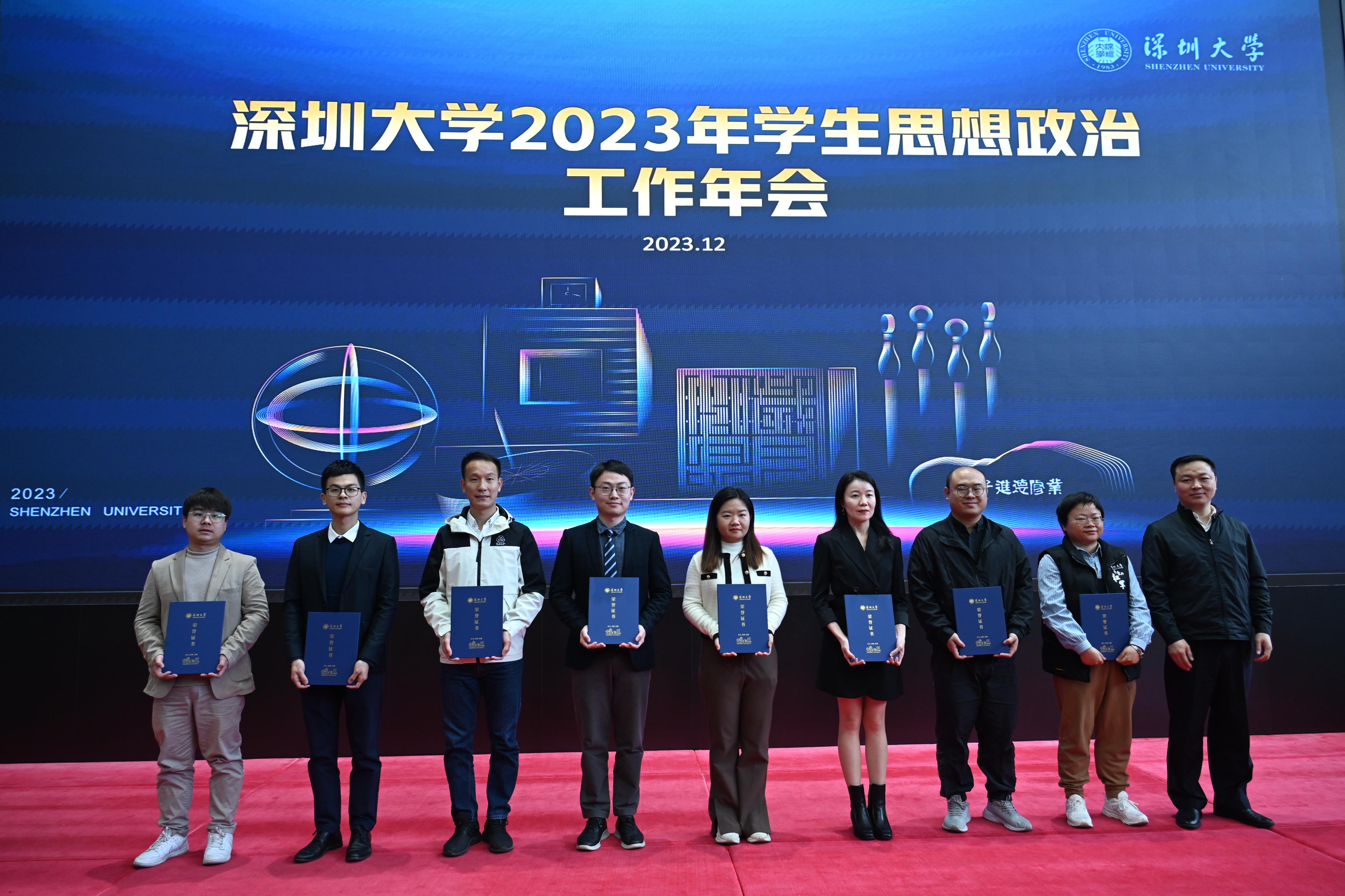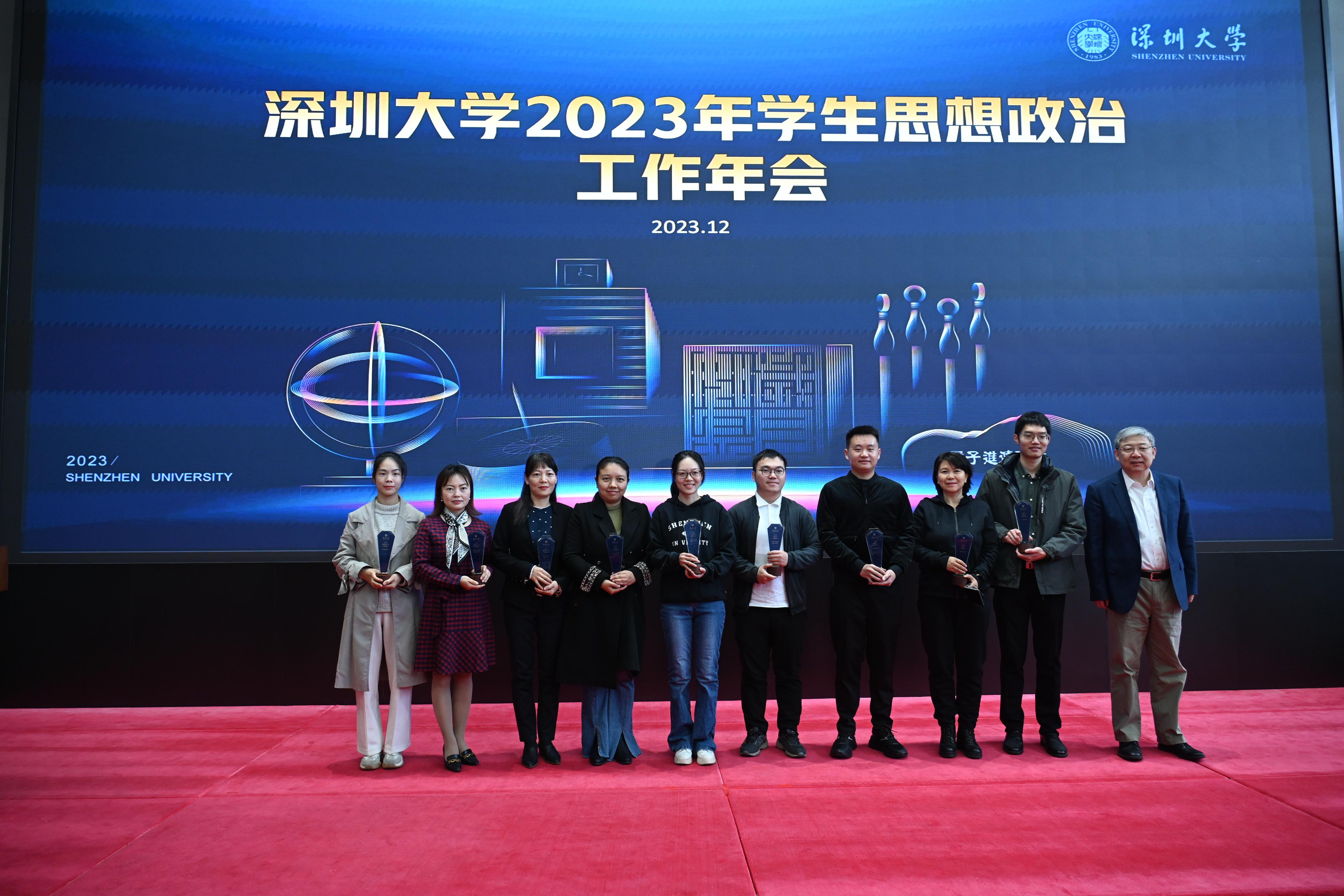 12月27日,深圳大學2023年學生思想政治教育工作年會在粵海校區校友廣場多功能廳召開。校黨委書記李清泉、黨委副書記吳報水、副校長汪永成出席會議,黨委組織統戰部、黨委宣傳部、黨委學工部、校團委、各學院(部)負責人以及教師代表、輔導員代表參加會議。
