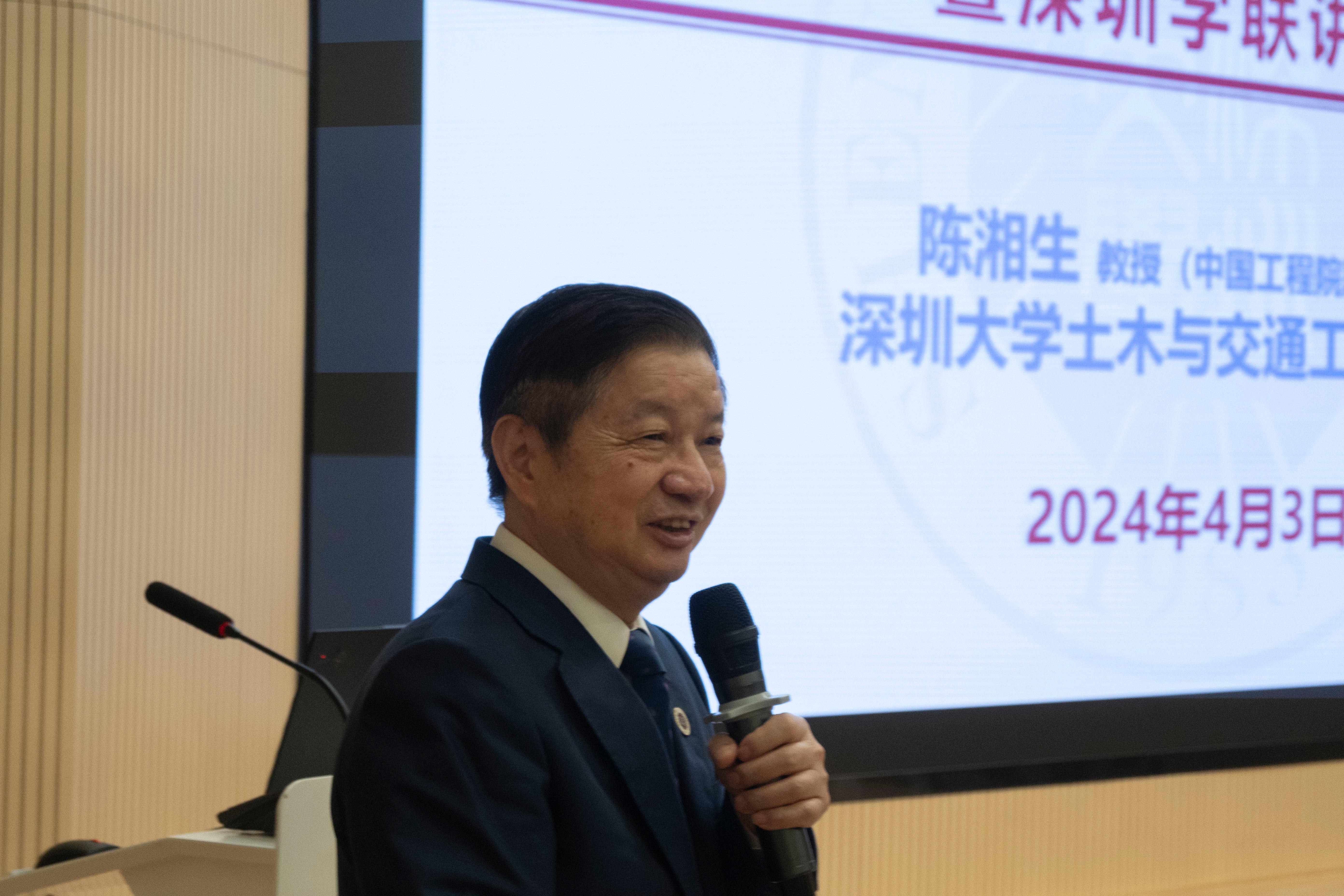 4月3日下午,深圳大學土木與交通工程學院2024年春季學期“思政第一課”暨深圳學聯講堂(第二期)在深圳大學粵海校區南區致工樓報告廳開講。深圳大學土木與交通工程學院院長、中國工程院院士陳湘生以“土木工程發展與青年人的使命”為題,結合自身科研經歷,為同學們帶來了一堂別開生面的思政課,探討土木工程未來的發展前景,鼓勵學子扛起未來之責。深圳大學團委、土木與交通工程學院相關負責人、學生代表以及各高校學聯代表等現場聆聽。