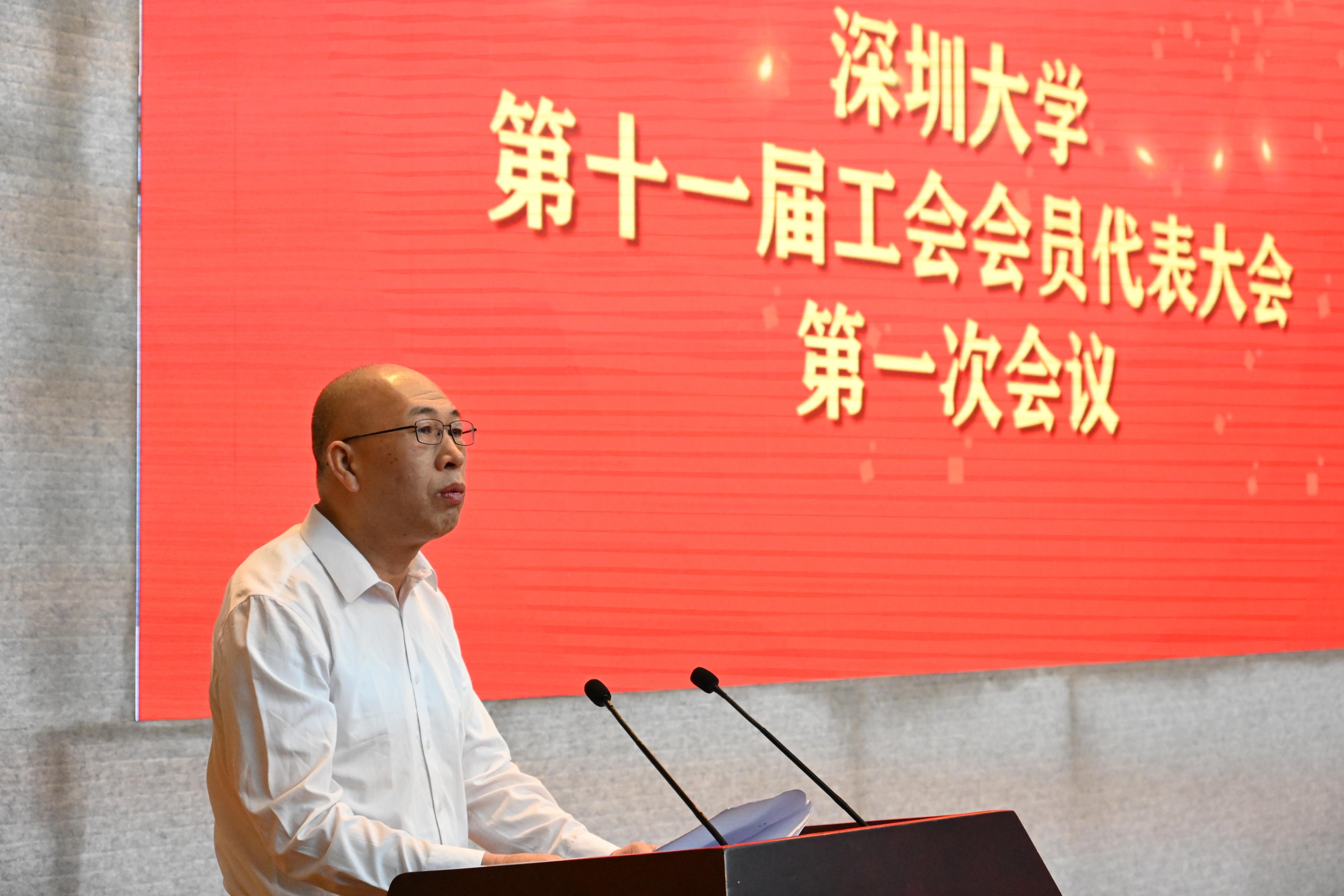 楊平宣讀上級工會批復并致辭。他代表市委教育工委、市委教育工委工會聯合會對大會的召開表示熱烈祝賀,并向出席會議的各位工會會員代表致以誠摯問候。楊平對即將選舉產生的深圳大學新一屆工會委員會提出期望:一是提高政治站位,強化責任擔當,確保工會工作始終與學校黨政工作同頻共振,共同向前;二是發揮工會職能,服務學校發展大局,要立足學校發展和長遠建設,形成推動學校高質量發展的共識;三是加強工會自身建設,激發工會的組織能力,積極推進工會組織治理體系和治理能力的現代化建設。楊平指出,勞動創造幸福,奮斗鑄就偉業。希望深圳大學工會在學校黨委的領導下,振奮精神,開拓進取,以昂揚向上的工作熱情和與時俱進的精神狀態,共同推動學校教育工作高質量發展,努力開創深圳大學工會工作的新局面。