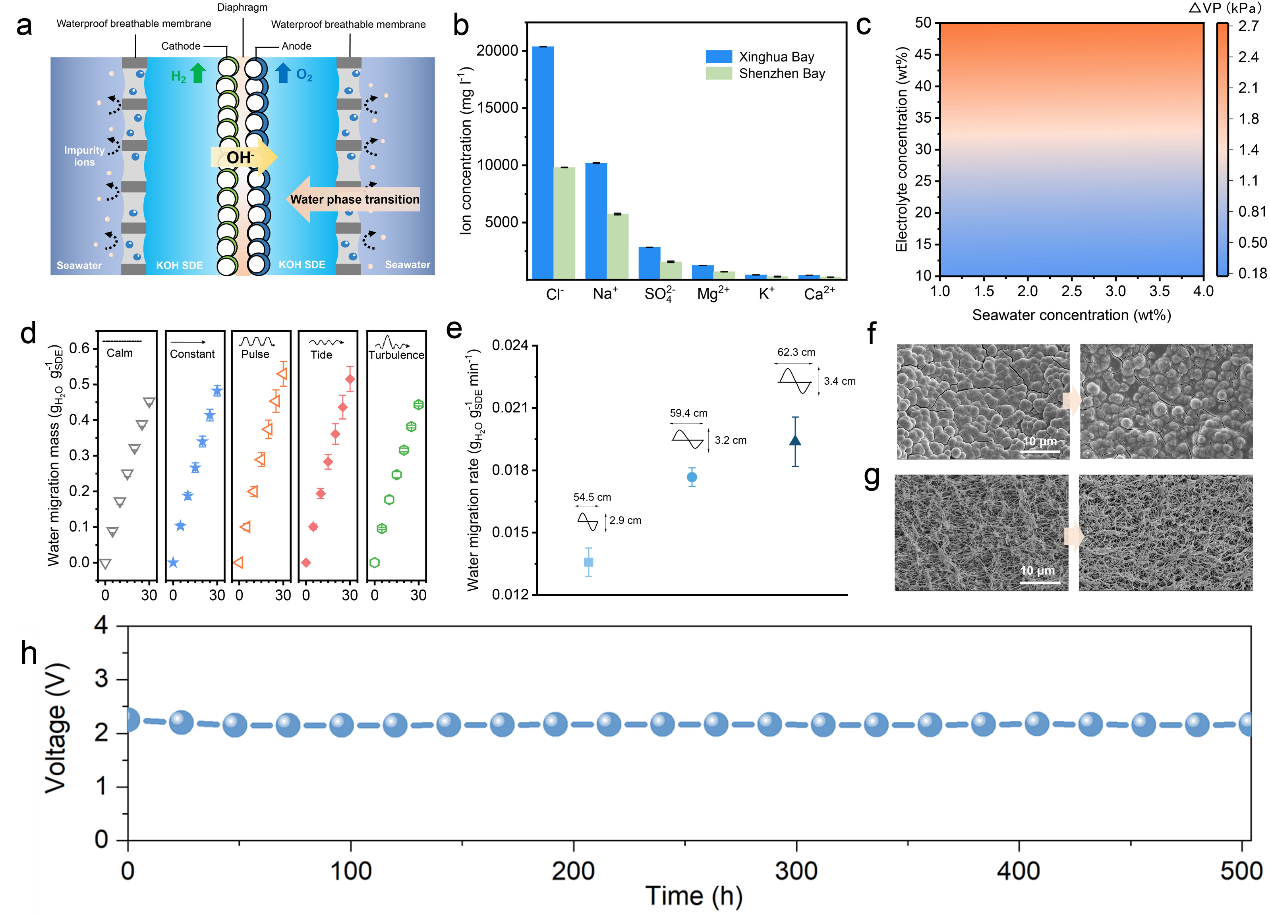 針對前述挑戰,謝和平院士團隊通過將分子擴散、界面相平衡等物理力學過程與電化學反應結合,開創了海水原位直接電解制氫全新原理與技術(Nature, 2022, 612(7941): 673-678.),建立了氣液界面相變自遷移自驅動的海水直接電解制氫理論方法,形成了界面壓力差海水自發相變傳質的力學驅動機制,實現了無額外能耗的電化學反應協同海水遷移的動態自調節穩定海水直接電解制氫。自主研制的386 L/h H2原理樣機在深圳灣海水中穩定制氫超3200小時,全面解決了多年困擾科技界和產業界的難題;完美破解了海水電解制氫領域的半世紀難題,實現了把取之不盡的海水當純水一樣直接用于電解制氫。該技術被評為2022年中國科學十大進展。