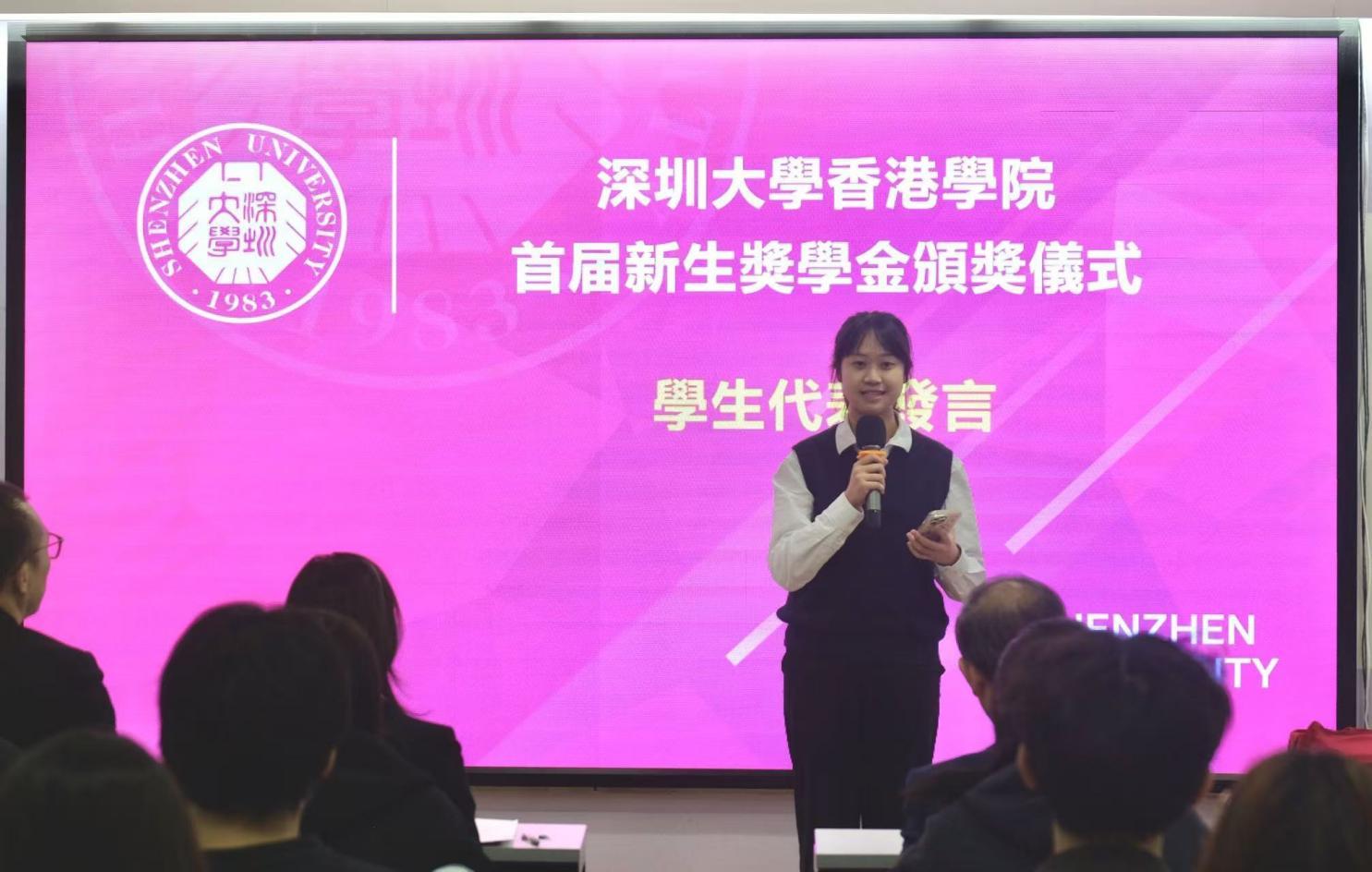 獲得一等獎學金的林紫盈同學代表獲獎學生發(fā)言。她表示,這份獎學金的榮譽承載著學校、學院和老師們的殷切期望與深情囑托。她呼吁同學們攜手并肩,在深圳大學香港學院這片充滿希望的沃土上綻放青春的絢爛光彩,為璀璨的未來奮力拼搏。