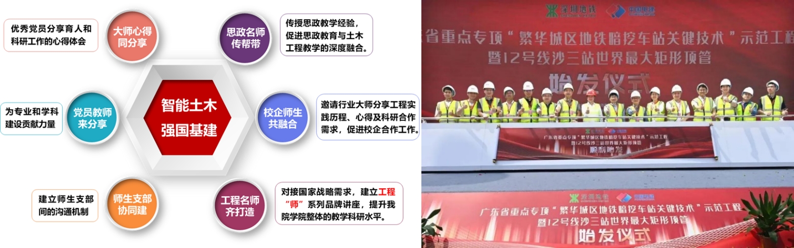 支部創建了工程“師”特色黨建品牌,形成了以院士黨員為龍頭、中青年黨員教師為骨干,以立德樹人、科研報國、服務社會為目標,將黨建與業務相融合、雙融雙促、共促共榮的新局面。參與重組2個全國重點實驗室,獲批1個國家工程研究中心,承擔了多項頂天立地的科教項目,在地下空間開發與利用領域處于全國領先地位。