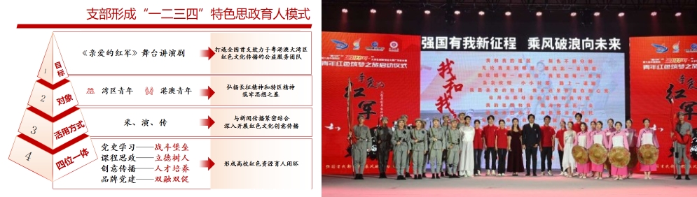 支部是全校首個跨學院跨專業的師生聯合黨支部,打造了黨史學習、黨建品牌、課程思政、創意傳播“四位一體”紅色資源育人模式,原創的舞臺講演劇《親愛的紅軍》,在國內公益巡演42場,觀眾達6萬余人,獲得光明日報、人民網等主流媒體130余次報道,12次榮登學習強國,影響人數超180萬,成為國內高校知名的紅色文化傳播品牌。