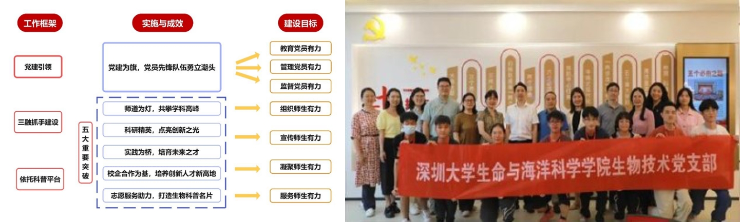 支部形成了以黨建為軸,以科教融合、產教融合、賽教融合為業務抓手,以生物科普教育為服務平臺,推動黨建與業務發展相融合。黨員教師發表了深大首篇《Nature》正刊論文、承擔首個國家重點研發計劃項目,獲教育部、省教學成果獎十余項,指導學生在競賽中獲獎80余項,推動生物技術專業入選“國家一流本科專業建設點”,多名黨員以科技特派員、志愿者等身份幫扶鄉村、企業,科普教育服務5000余人次。